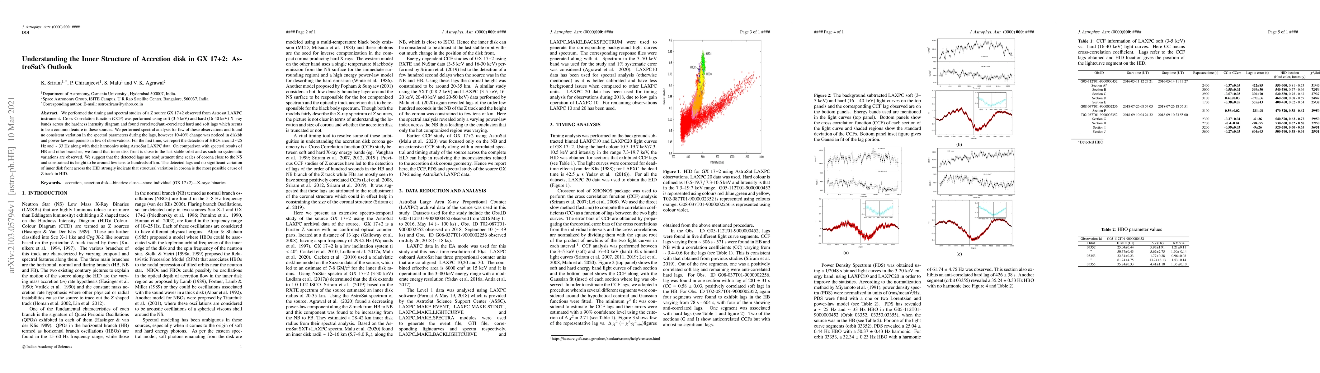 We performed the timing and spectral studies of a Z source GX 17+2 observed from Astrosat LAXPC instrument. Cross-Correlation function (CCF) was performed using soft (3-5 keV) and hard (16-40 keV) X -ray bands across the hardness intensity diagram and found correlated/anti-correlated hard and soft lags which seems to be a common feature in these sources. We performed spectral analysis for few of these observations and found no consistent variation in the spectral parameters during the lags, however 10-40% change was noticed in diskbb and power-law components in few of observations. For the first time, we report the detection of HBOs around $\sim$25 Hz and $\sim$ 33 Hz along with their harmonics using AstroSat LAXPC data. On comparison with spectral results of HB and other branches, we found that inner disk front is close to the last stable orbit and as such no systematic variations are observed. We suggest that the detected lags are readjustment time scales of corona close to the NS and constrained its height to be around few tens to hundreds of km. The detected lags and no significant variation of inner disk front across the HID strongly indicate that structural variation in corona is the most possible cause of Z track in HID.