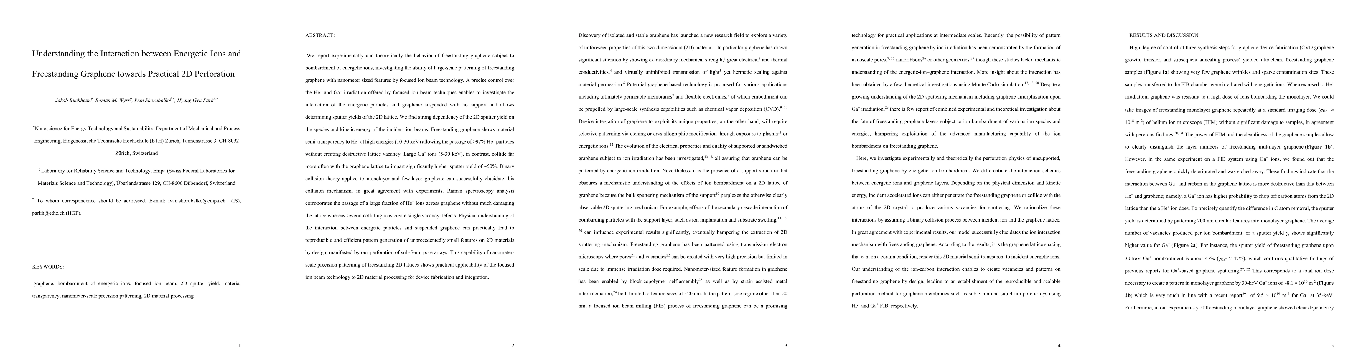This study experimentally and theoretically investigates the interaction between energetic ions and freestanding graphene, revealing significant differences in sputter yields based on ion species and energy. The results show that He+ ions can pass through graphene largely intact, while Ga+ ions cause substantial lattice damage, enabling precise nanometer-scale patterning of graphene for advanced 2D material applications.
