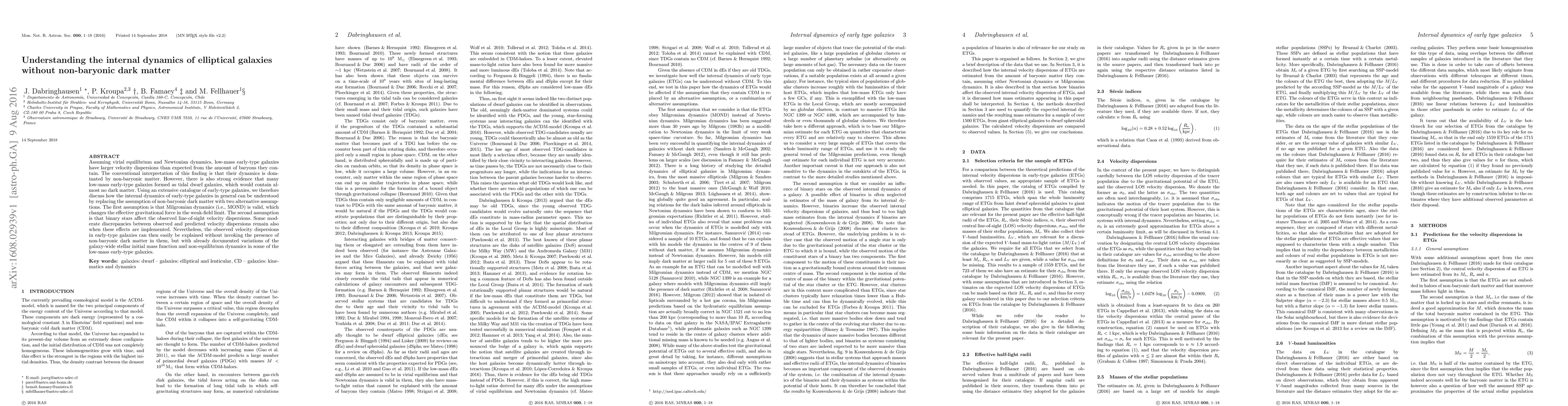 This paper explores the internal dynamics of elliptical galaxies without relying on non-baryonic dark matter, proposing Milgromian dynamics and binary star effects as alternative explanations for the observed velocity dispersions. Despite some discrepancies, these alternatives suggest that baryonic matter alone can account for the dynamics in these galaxies.
