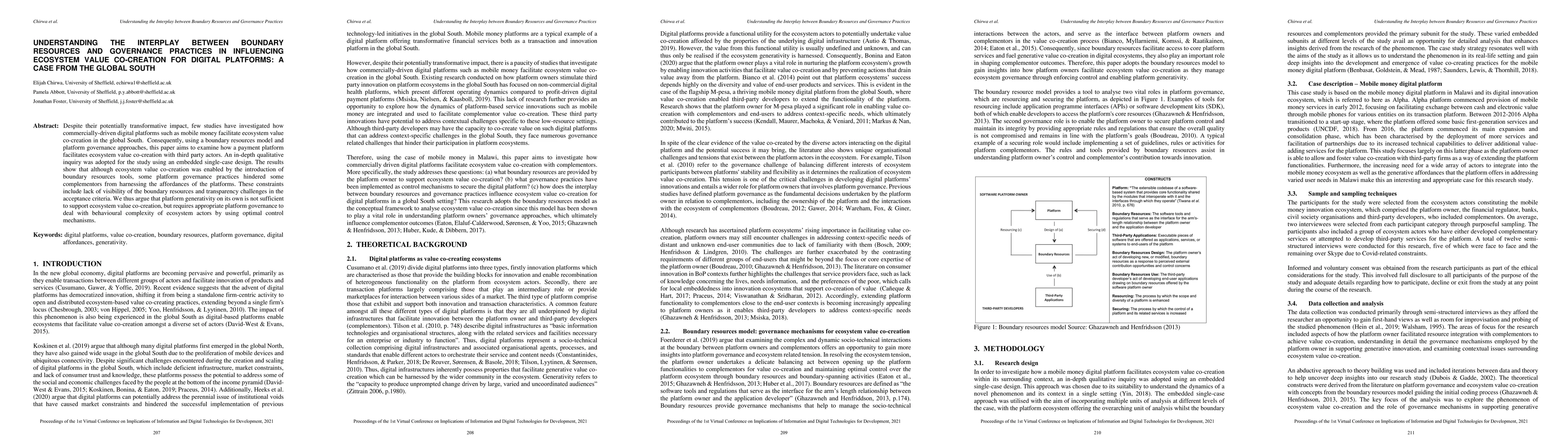This paper explores how boundary resources and governance practices influence ecosystem value co-creation on mobile payment platforms in the Global South. Findings reveal that while boundary resources facilitate co-creation, inadequate governance hinders complementors from fully leveraging platform affordances due to visibility and transparency issues.