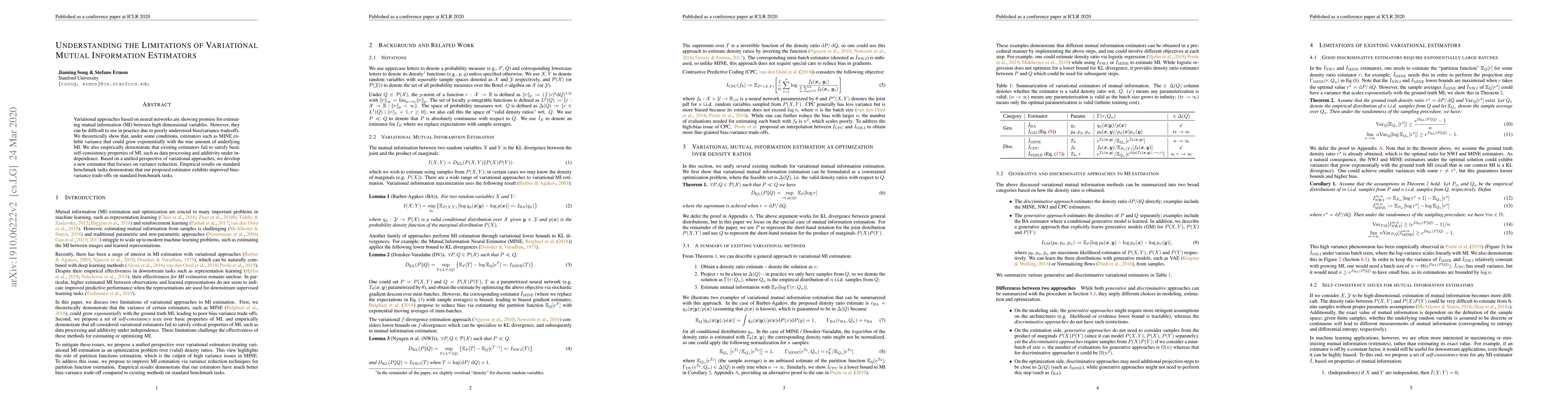 This paper investigates the limitations of variational estimators for mutual information, revealing that existing methods like MINE can have exponentially increasing variance with true MI. It proposes a new estimator aimed at variance reduction, which empirically shows better bias-variance trade-offs and adherence to MI properties on benchmark tasks.