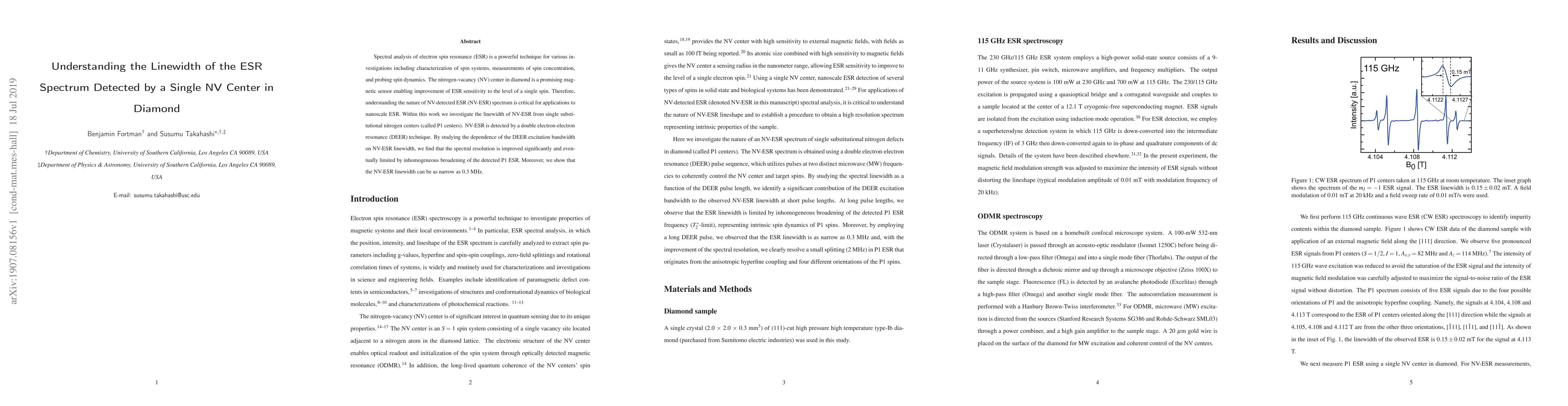 This study investigates the linewidth of electron spin resonance (ESR) detected by a single NV center in diamond using DEER techniques, revealing that the NV-ESR linewidth can be as narrow as 0.3 MHz, with spectral resolution limited by inhomogeneous broadening.