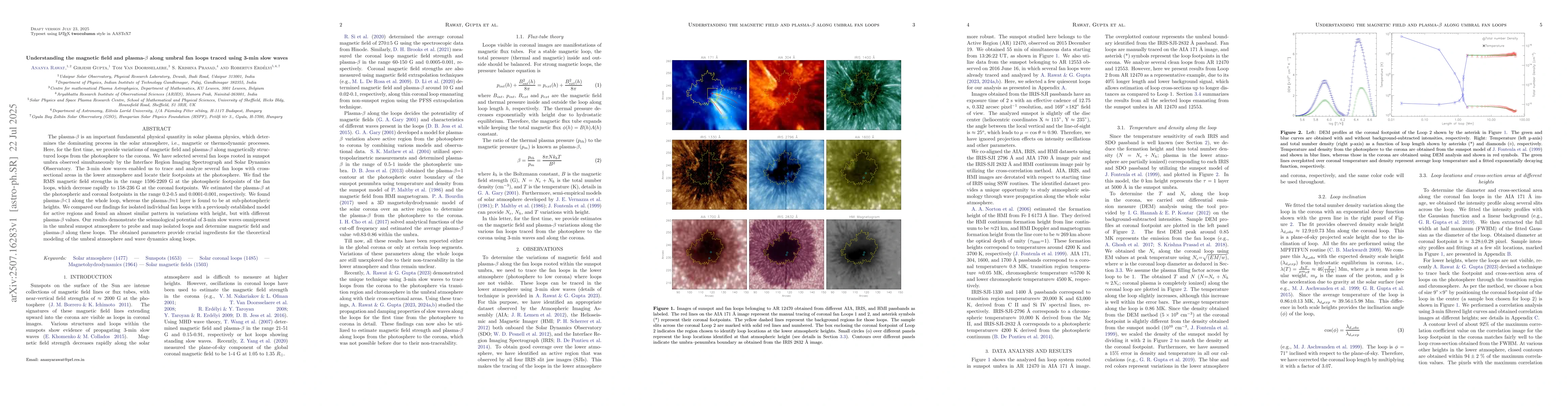 The plasma-$\beta$ is an important fundamental physical quantity in solar plasma physics, which determines the dominating process in the solar atmosphere, i.e., magnetic or thermodynamic processes. Here, for the first time, we provide variations of magnetic field and plasma-$\beta$ along magnetically structured loops from the photosphere to the corona. We have selected several fan loops rooted in sunspot umbra observed simultaneously by the Interface Region Imaging Spectrograph and Solar Dynamics Observatory. The 3-min slow waves enabled us to trace and analyze several fan loops with cross-sectional areas in the lower atmosphere and locate their footpoints at the photosphere. We find the RMS magnetic field strengths in the range 1596-2269 G at the photospheric footpoints of the fan loops, which decrease rapidly to 158-236 G at the coronal footpoints. We estimated the plasma-$\beta$ at the photospheric and coronal footpoints in the range 0.2-0.5 and 0.0001-0.001, respectively. We found plasma-$\beta$$<$$1$ along the whole loop, whereas the plasma-$\beta$$\approx$$1$ layer is found to be at sub-photospheric heights. We compared our findings for isolated individual fan loops with a previously established model for active regions and found an almost similar pattern in variations with height, but with different plasma-$\beta$ values. Our results demonstrate the seismological potential of 3-min slow waves omnipresent in the umbral sunspot atmosphere to probe and map isolated loops and determine magnetic field and plasma-$\beta$ along these loops. The obtained parameters provide crucial ingredients for the theoretical modeling of the umbral atmosphere and wave dynamics along loops.