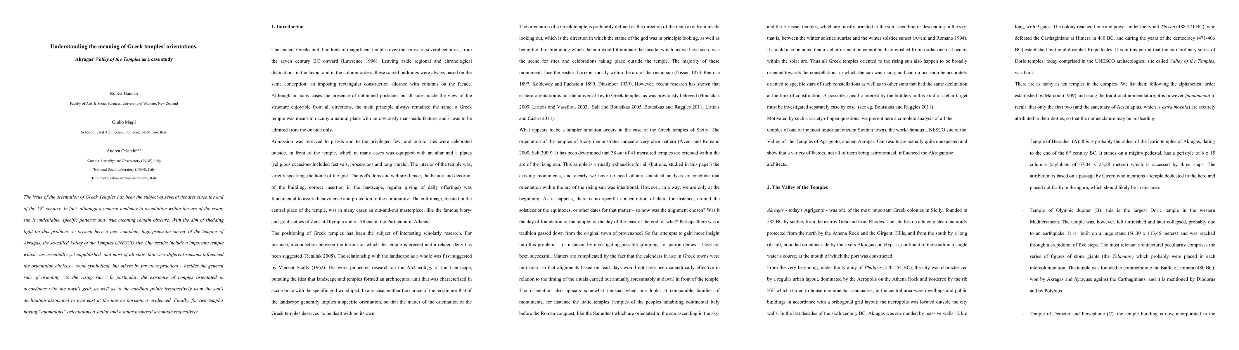This study conducts a high-precision survey of Greek temples in Akragas' Valley of the Temples, revealing diverse orientation reasons beyond the general rising sun alignment, including symbolic, practical, and grid-based factors. The research also proposes stellar and lunar explanations for two temples with unusual orientations.