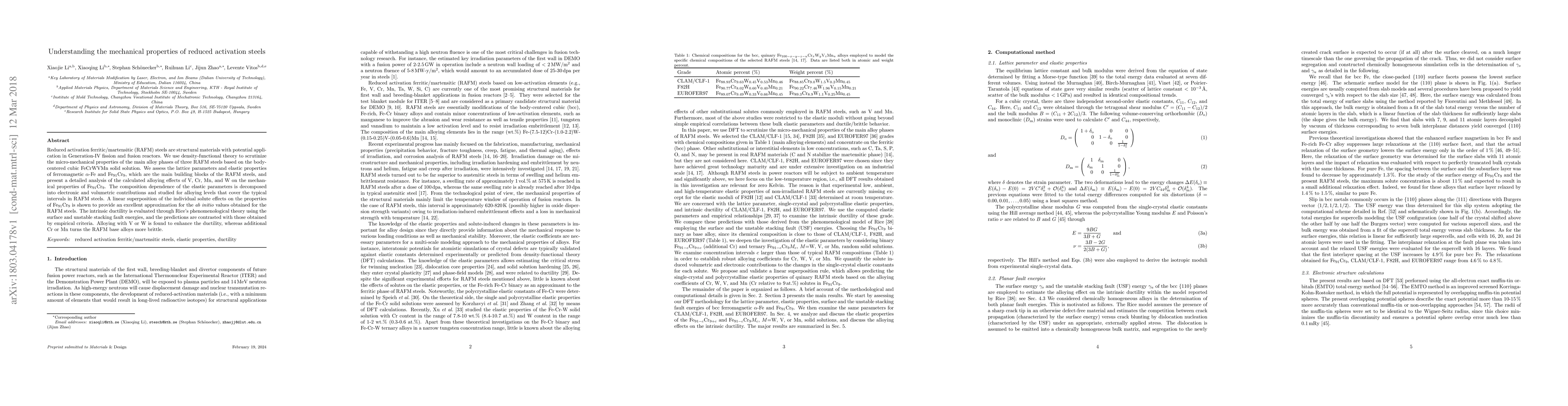 This paper uses density-functional theory to analyze the mechanical properties of reduced activation ferritic/martensitic steels, focusing on the effects of alloying elements V, Cr, Mn, and W on the base Fe$_{91}$Cr$_{9}$ alloy. The study finds that alloying with V or W enhances ductility, while Cr or Mn increases brittleness.