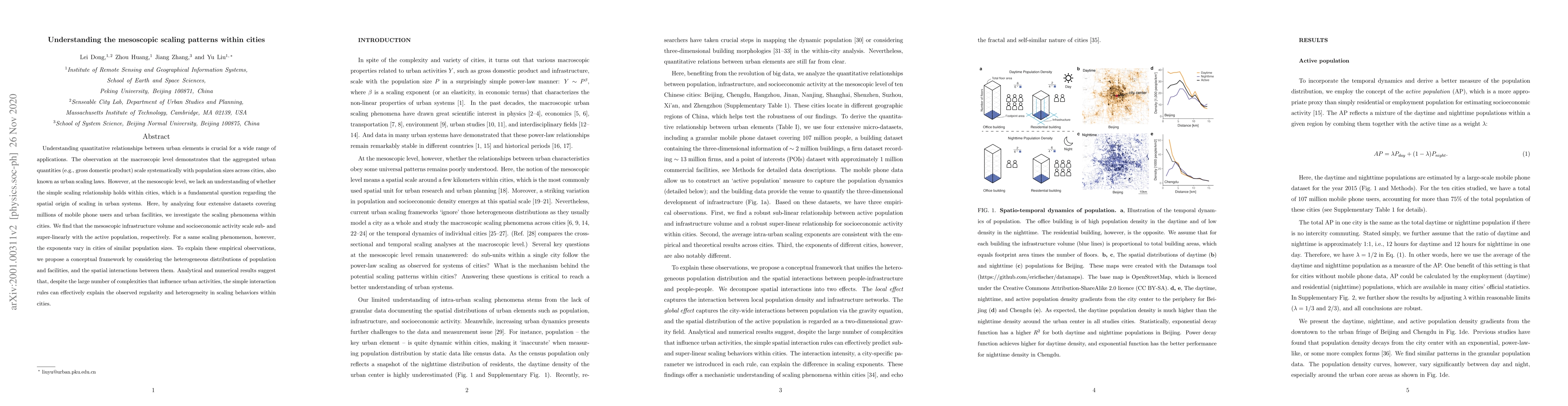 This paper investigates scaling patterns at the mesoscopic level within cities, finding that infrastructure volume scales sub-linearly while socioeconomic activity scales super-linearly with the active population. The study proposes a conceptual framework to explain these variations, emphasizing the role of population distribution and spatial interactions.