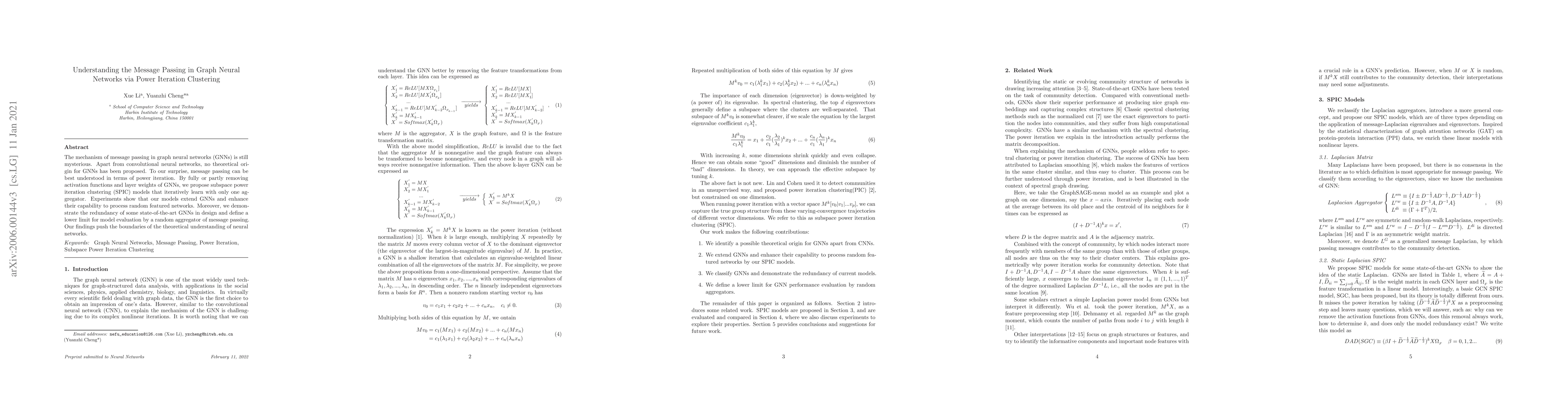 This paper explores the theoretical underpinnings of message passing in graph neural networks (GNNs) by framing it as a power iteration process. It introduces subspace power iteration clustering (SPIC) models to demonstrate the mechanism, revealing the redundancy in some current GNN designs and establishing a theoretical lower limit for model evaluation.