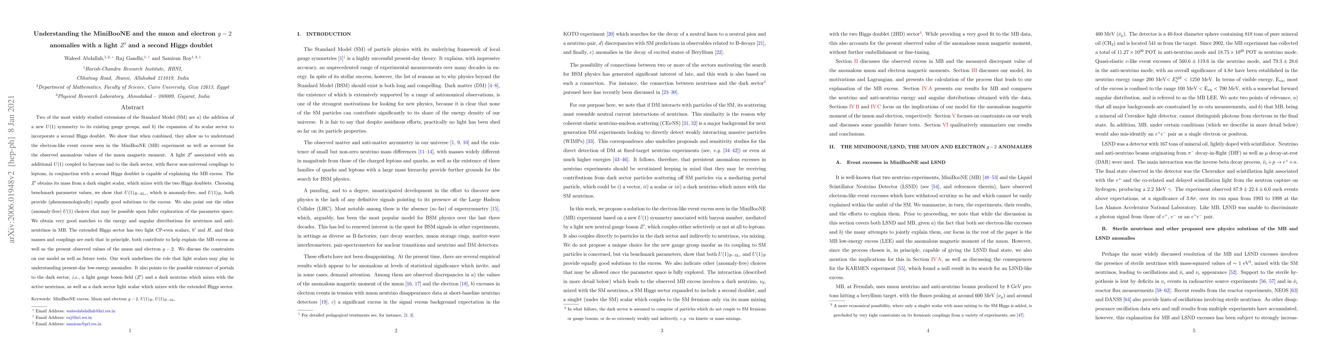Two of the most widely studied extensions of the Standard Model (SM) are $a)$ the addition of a new $U(1)$ symmetry to its existing gauge groups, and $b)$ the expansion of its scalar sector to incorporate a second Higgs doublet. We show that when combined, they allow us to understand the electron-like event excess seen in the MiniBooNE (MB) experiment as well as account for the observed anomalous values of the muon magnetic moment. A light $Z'$ associated with an additional $U(1)$ coupled to baryons and to the dark sector, with flavor non-universal couplings to leptons, in conjunction with a second Higgs doublet is capable of explaining the MB excess. The $Z'$ obtains its mass from a dark singlet scalar, which mixes with the two Higgs doublets. Choosing benchmark parameter values, we show that $U(1)_{B-3L_\tau}$, which is anomaly-free, and $U(1)_B$, both provide (phenomenologically) equally good solutions to the excess. We also point out the other (anomaly-free) $U(1)$ choices that may be possible upon fuller exploration of the parameter space. We obtain very good matches to the energy and angular distributions for neutrinos and anti-neutrinos in MB. The extended Higgs sector has two light CP-even scalars, $h'$ and $H$, and their masses and couplings are such that in principle, both contribute to help explain the MB excess as well as the present observed values of the muon and electron $g-2$. We discuss the constraints on our model as well as future tests. Our work underlines the role that light scalars may play in understanding present-day low-energy anomalies. It also points to the possible existence of portals to the dark sector, i.e., a light gauge boson field $(Z')$ and a dark neutrino which mixes with the active neutrinos, as well as a dark sector light scalar which mixes with the extended Higgs sector.