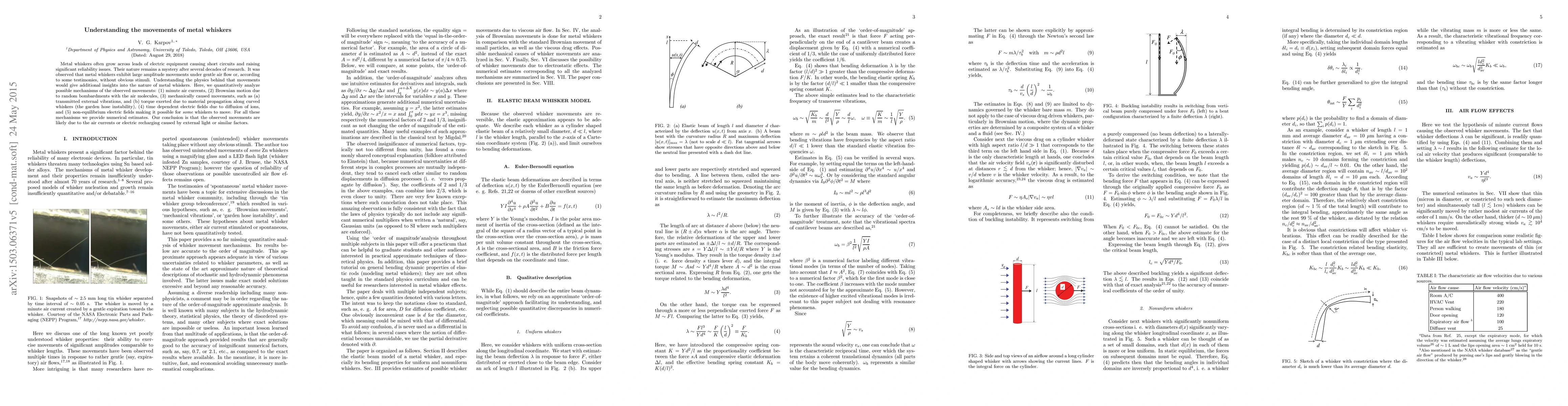 This paper investigates the dynamic movements of metal whiskers, which cause reliability issues in electronic equipment. The study quantitatively analyzes potential mechanisms behind these movements, concluding that minor air currents are most likely responsible, with external vibrations and nonequilibrium electric fields also playing a role under specific conditions.