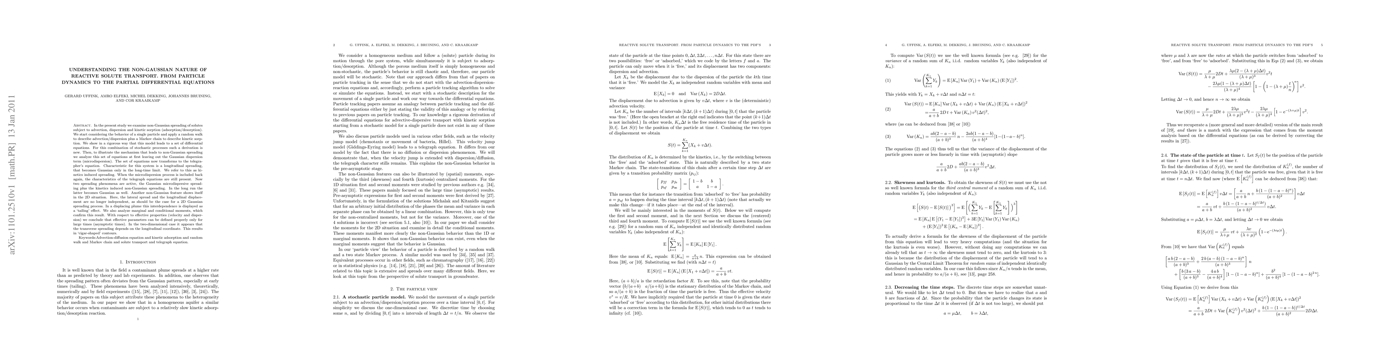 In the present study we examine non-Gaussian spreading of solutes subject to advection, dispersion and kinetic sorption (adsorption/desorption). We start considering the behavior of a single particle and apply a random walk to describe advection/dispersion plus a Markov chain to describe kinetic sorption. We show in a rigorous way that this model leads to a set of differential equations. For this combination of stochastic processes such a derivation is new. Then, to illustrate the mechanism that leads to non-Gaussian spreading we analyze this set of equations at first leaving out the Gaussian dispersion term (microdispersion). The set of equations now transforms to the telegrapher's equation. Characteristic for this system is a longitudinal spreading, that becomes Gaussian only in the long-time limit. We refer to this as kinetics induced spreading. When the microdispersion process is included back again, the characteristics of the telegraph equations are still present. Now two spreading phenomena are active, the Gaussian microdispersive spreading plus the kinetics induced non-Gaussian spreading. In the long run the latter becomes Gaussian as well. Another non-Gaussian feature shows itself in the 2D situation. Here, the lateral spread and the longitudinal displacement are no longer independent, as should be the case for a 2D Gaussian spreading process. In a displacing plume this interdependence is displayed as a `tailing' effect. We also analyze marginal and conditional moments, which confirm this result. With respect to effective properties (velocity and dispersion) we conclude that effective parameters can be defined properly only for large times (asymptotic times). In the two-dimensional case it appears that the transverse spreading depends on the longitudinal coordinate. This results in `cigar-shaped' contours.
