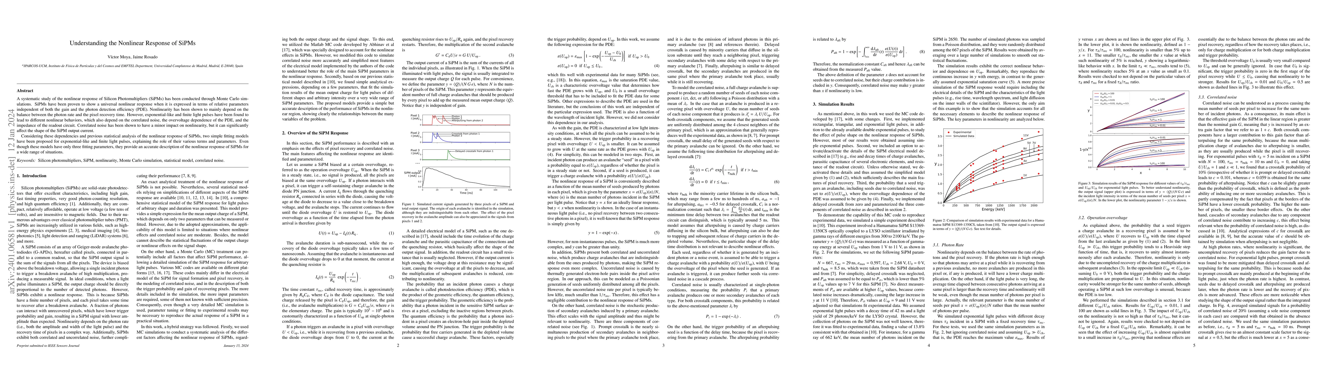 This paper investigates the nonlinear response of Silicon Photomultipliers (SiPMs) via Monte Carlo simulations, revealing that nonlinearity primarily depends on the balance between photon rate and pixel recovery time, with minor impacts from correlated noise. Two fitting models are proposed to describe the nonlinear behavior for different light pulse types, providing accurate descriptions with minimal parameters.