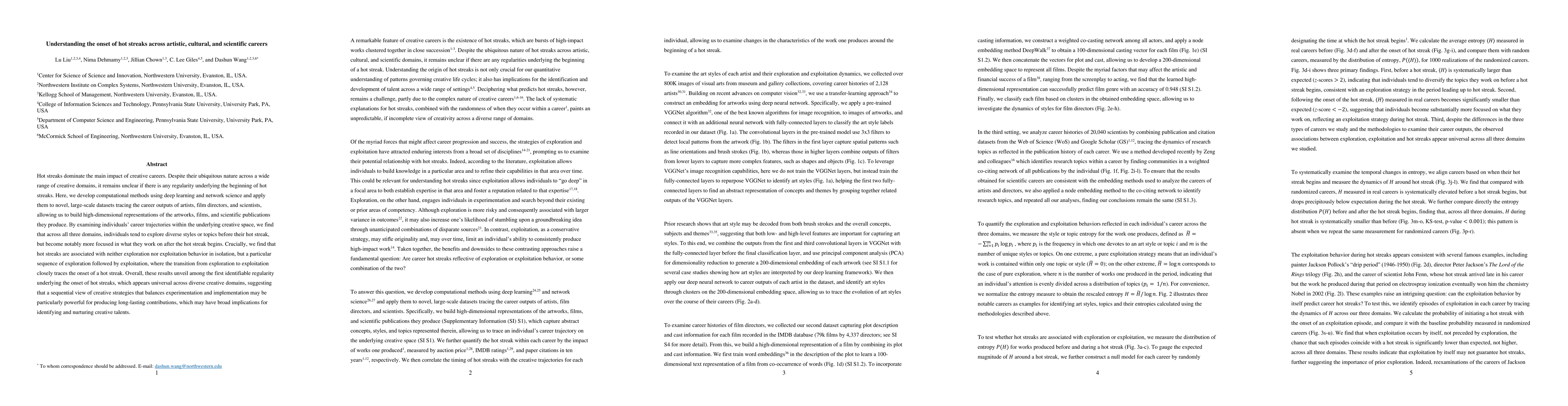 This paper uses deep learning and network science to analyze large-scale datasets of artists, film directors, and scientists, revealing that hot streaks in creative careers follow a pattern of initial diverse exploration followed by focused exploitation. This sequential strategy appears to be a key factor in the onset of hot streaks across various creative domains.