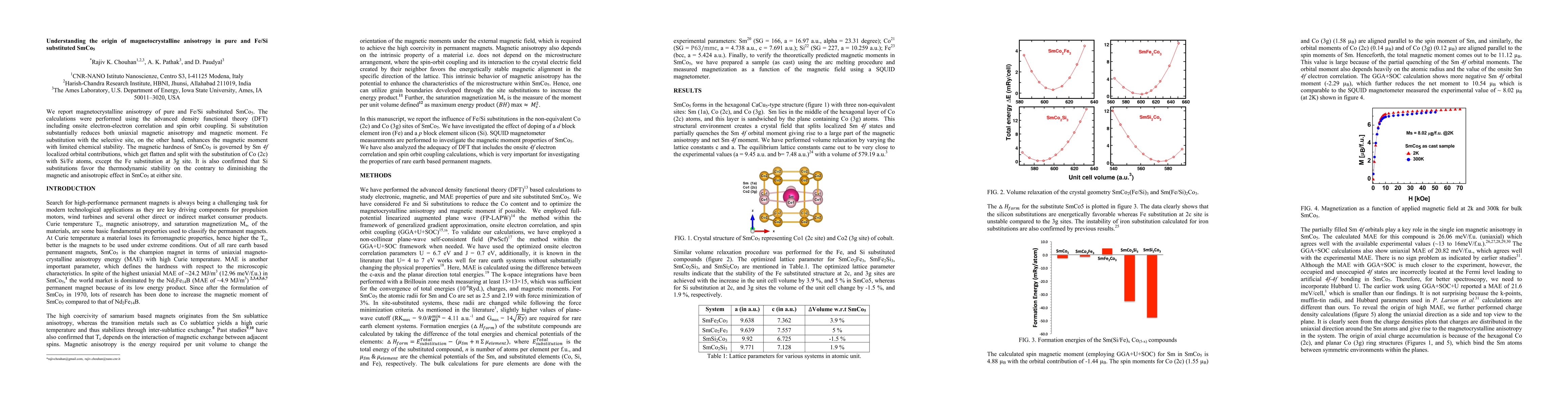 Researchers used density functional theory to study how adding silicon or iron to SmCo5 affects its magnetic properties, finding that silicon reduces anisotropy but adds stability, while iron enhances magnetism with limited chemical stability.