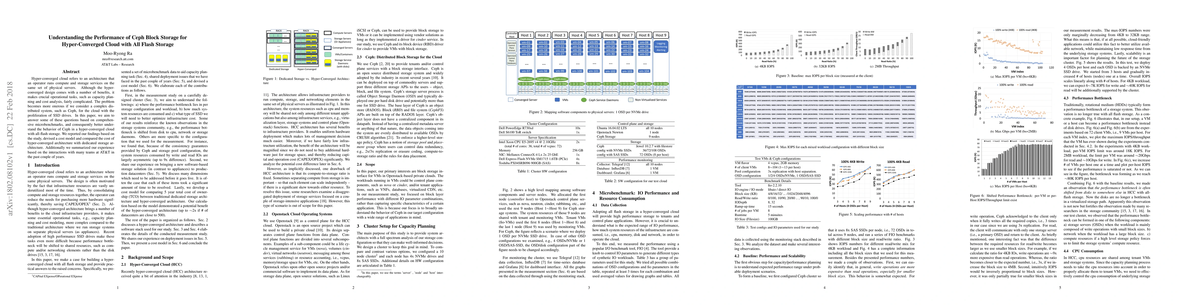 This paper evaluates the performance of Ceph block storage in hyper-converged cloud environments using all-flash storage, providing insights through microbenchmarks and a cost model comparison between hyper-converged and dedicated storage architectures. The study also incorporates experiences from interactions with AT&T teams.