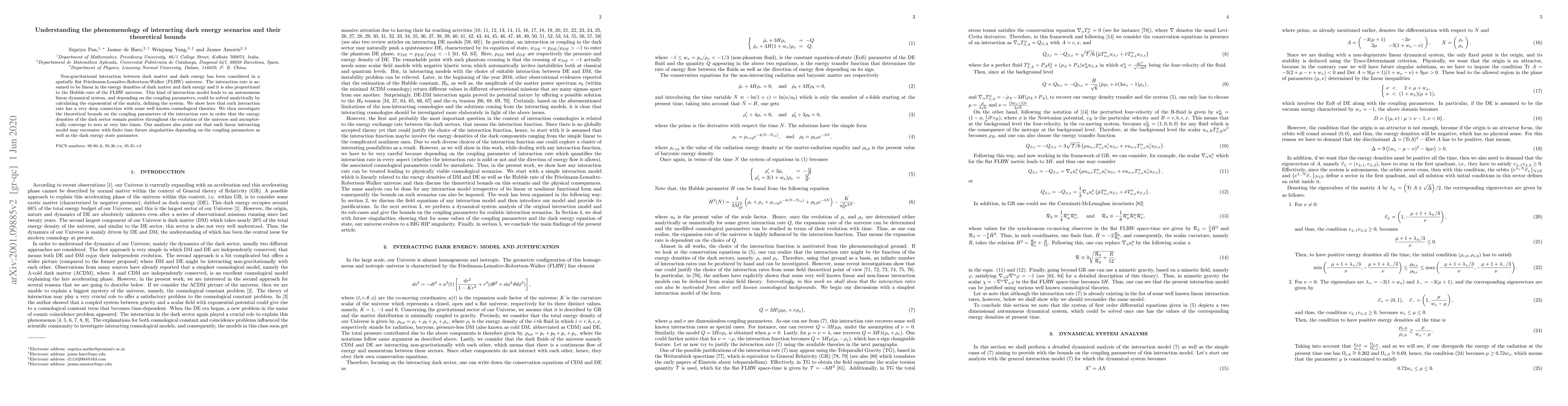 Non-gravitational interaction between dark matter and dark energy has been considered in a spatially flat Friedmann-Lema\^{i}tre-Robertson-Walker (FLRW) universe. The interaction rate is assumed to be linear in the energy densities of dark matter and dark energy and it is also proportional to the Hubble rate of the FLRW universe. This kind of interaction model leads to an autonomous linear dynamical system, and depending on the coupling parameters, could be solved analytically by calculating the exponential of the matrix, defining the system. We show here that such interaction rate has a very deep connection with some well known cosmological theories. We then investigate the theoretical bounds on the coupling parameters of the interaction rate in order that the energy densities of the dark sector remain positive throughout the evolution of the universe and asymptotically converge to zero at very late times. Our analyses also point out that such linear interacting model may encounter with finite time future singularities depending on the coupling parameters as well as the dark energy state parameter.