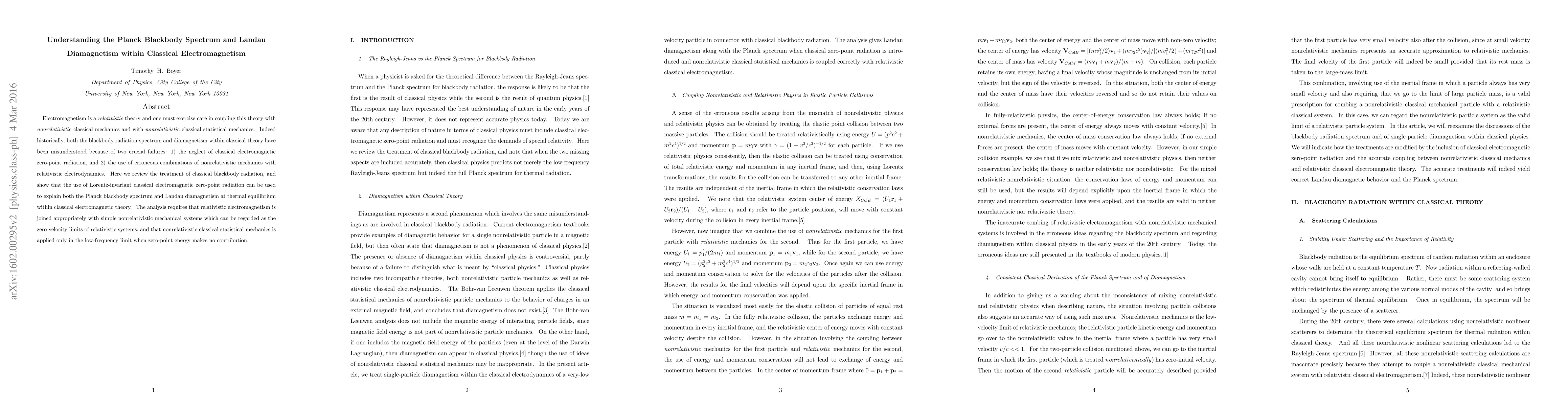 This paper reviews classical electromagnetism's treatment of blackbody radiation, demonstrating that incorporating Lorentz-invariant zero-point radiation resolves historical misunderstandings of the Planck spectrum and Landau diamagnetism. It emphasizes the necessity of combining relativistic electromagnetism with nonrelativistic mechanics in the appropriate limits.