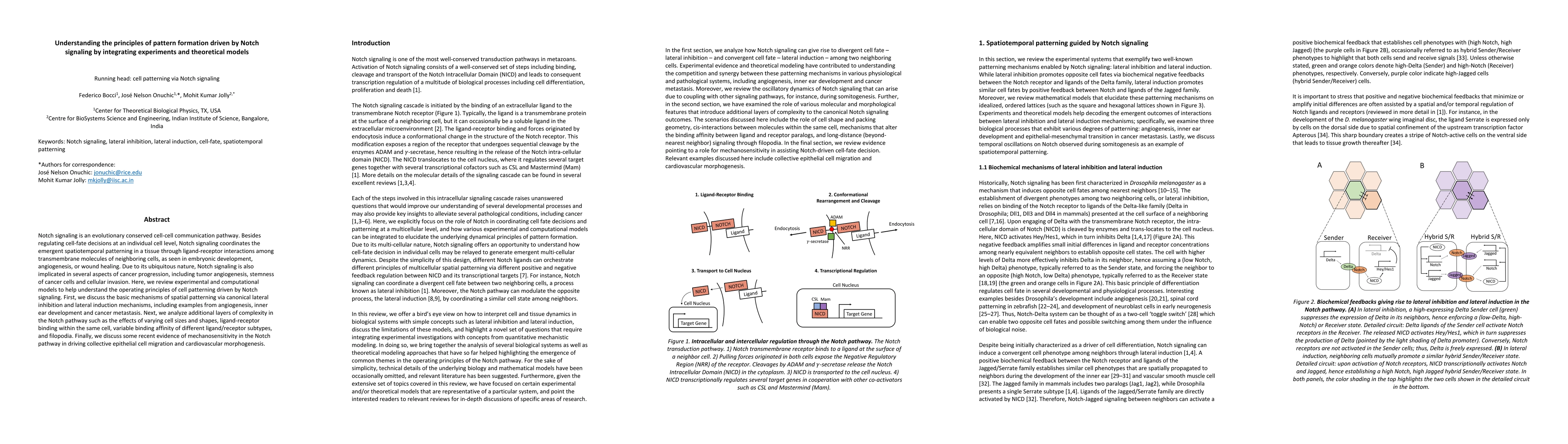 Notch signaling is an evolutionary conserved cell-cell communication pathway. Besides regulating cell-fate decisions at an individual cell level, Notch signaling coordinates the emergent spatiotemporal patterning in a tissue through ligand-receptor interactions among transmembrane molecules of neighboring cells, as seen in embryonic development, angiogenesis, or wound healing. Due to its ubiquitous nature, Notch signaling is also implicated in several aspects of cancer progression, including tumor angiogenesis, stemness of cancer cells and cellular invasion. Here, we review experimental and computational models to help understand the operating principles of cell patterning driven by Notch signaling. First, we discuss the basic mechanisms of spatial patterning via canonical lateral inhibition and lateral induction mechanisms, including examples from angiogenesis, inner ear development and cancer metastasis. Next, we analyze additional layers of complexity in the Notch pathway such as the effects of varying cell sizes and shapes, ligand-receptor binding within the same cell, variable binding affinity of different ligand/receptor subtypes, and filopodia. Finally, we discuss some recent evidence of mechanosensitivity in the Notch pathway in driving collective epithelial cell migration and cardiovascular morphogenesis.