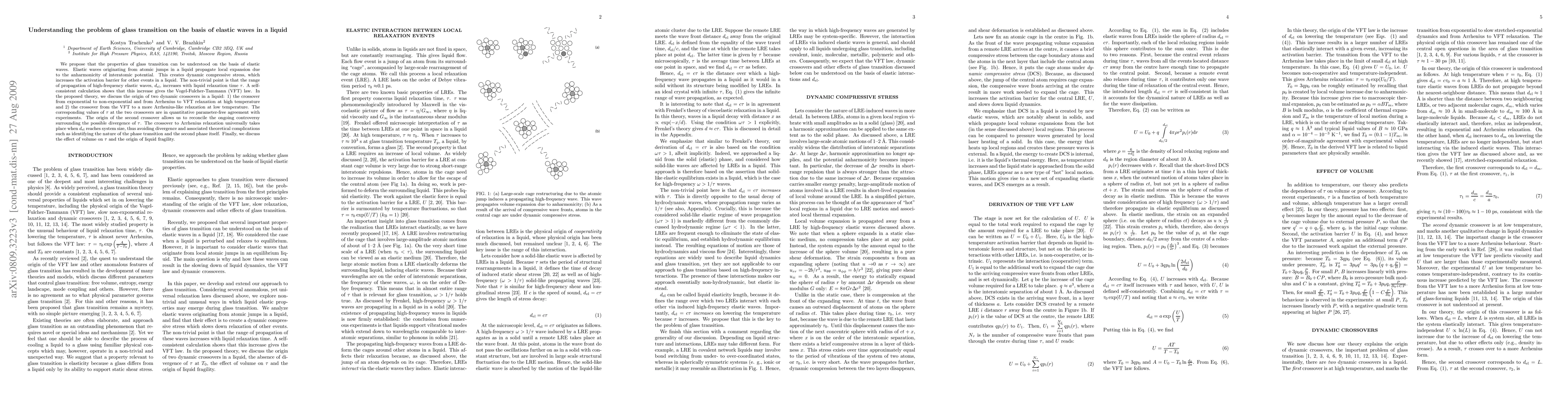 We propose that the properties of glass transition can be understood on the basis of elastic waves. Elastic waves originating from atomic jumps in a liquid propagate local expansion due to the anharmonicity of interatomic potential. This creates dynamic compressive stress, which increases the activation barrier for other events in a liquid. The non-trivial point is that the range of propagation of high-frequency elastic waves, $d_{\rm el}$, increases with liquid relaxation time $\tau$. A self-consistent calculation shows that this increase gives the Vogel-Fulcher-Tammann (VFT) law. In the proposed theory, we discuss the origin of two dynamic crossovers in a liquid: 1) the crossover from exponential to non-exponential and from Arrhenius to VFT relaxation at high temperature and 2) the crossover from the VFT to a more Arrhenius-like relaxation at low temperature. The corresponding values of $\tau$ at the two crossovers are in quantitative parameter-free agreement with experiments. The origin of the second crossover allows us to reconcile the ongoing controversy surrounding the possible divergence of $\tau$. The crossover to Arrhenius relaxation universally takes place when $d_{\rm el}$ reaches system size, thus avoiding divergence and associated theoretical complications such as identifying the nature of the phase transition and the second phase itself. Finally, we discuss the effect of volume on $\tau$ and the origin of liquid fragility.