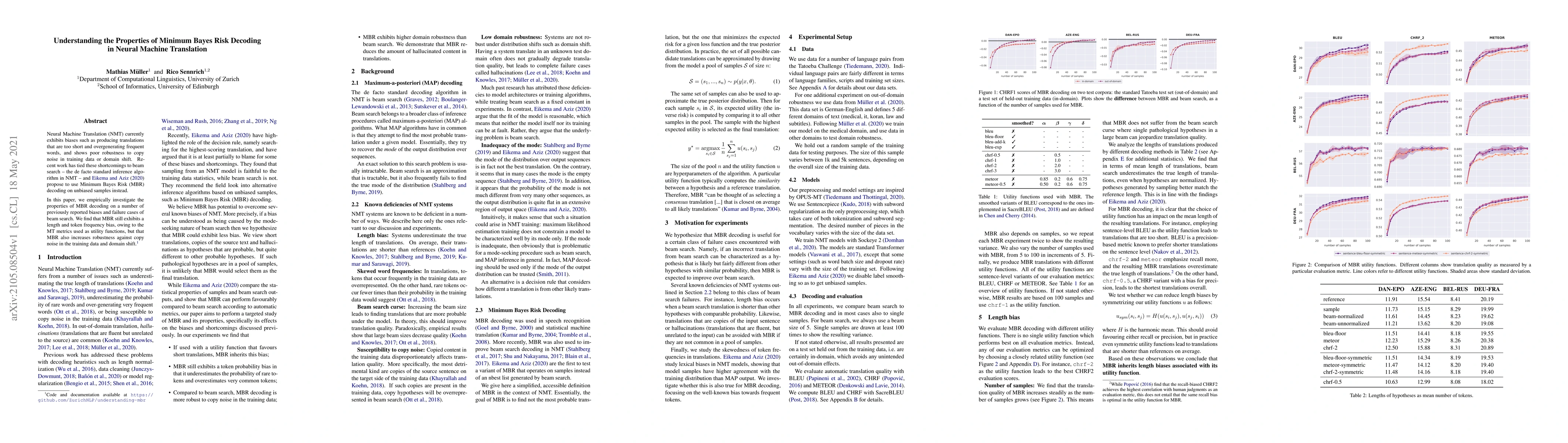 This paper investigates the properties of Minimum Bayes Risk (MBR) decoding in Neural Machine Translation (NMT), finding that while it reduces biases compared to beam search, it still exhibits length and token frequency biases due to underlying metrics, but enhances robustness against copy noise in training data and domain shift.