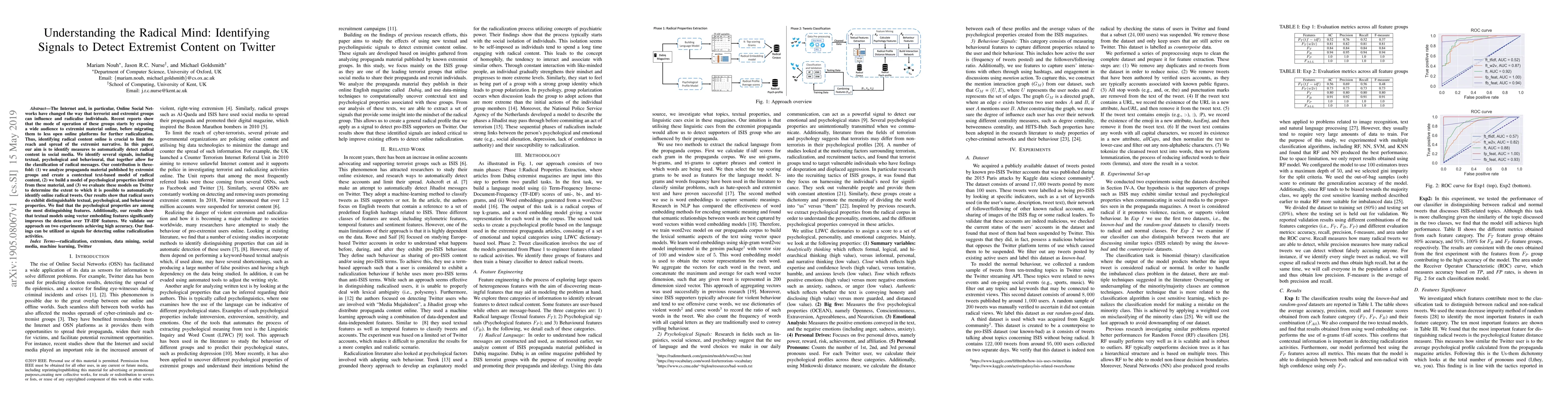 This paper develops methods to automatically detect radical content on Twitter by identifying textual, psychological, and behavioral signals. The study finds that psychological properties are key distinguishing features, and vector embedding models outperform traditional TF-IDF features, offering a robust approach for detecting online radicalization.