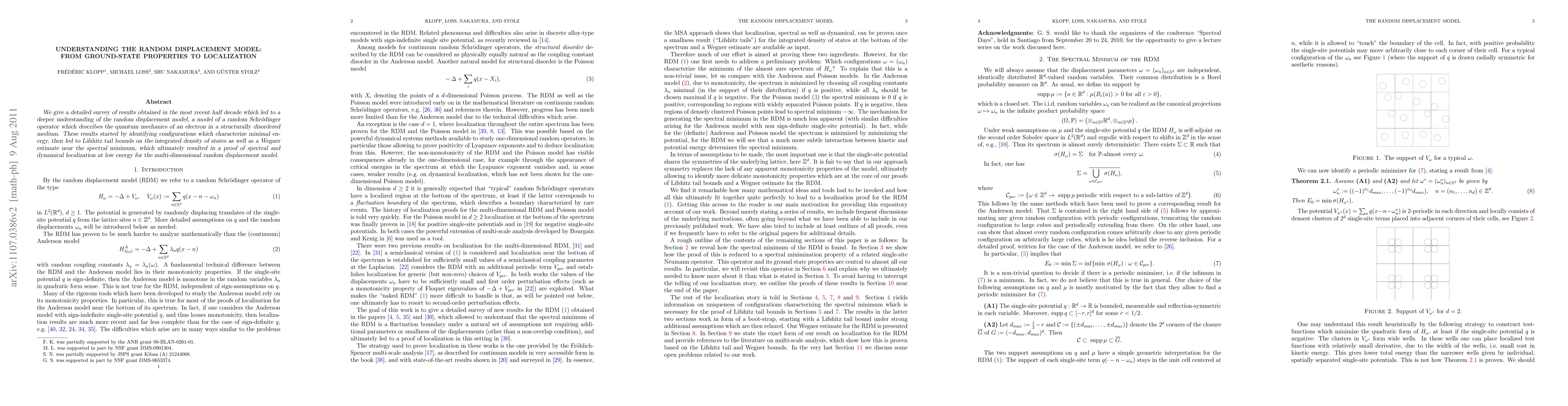 The random displacement model describes a quantum system in disordered media, leading to proof of spectral and dynamical localization at low energy through bounds on the integrated density of states and a Wegner estimate.