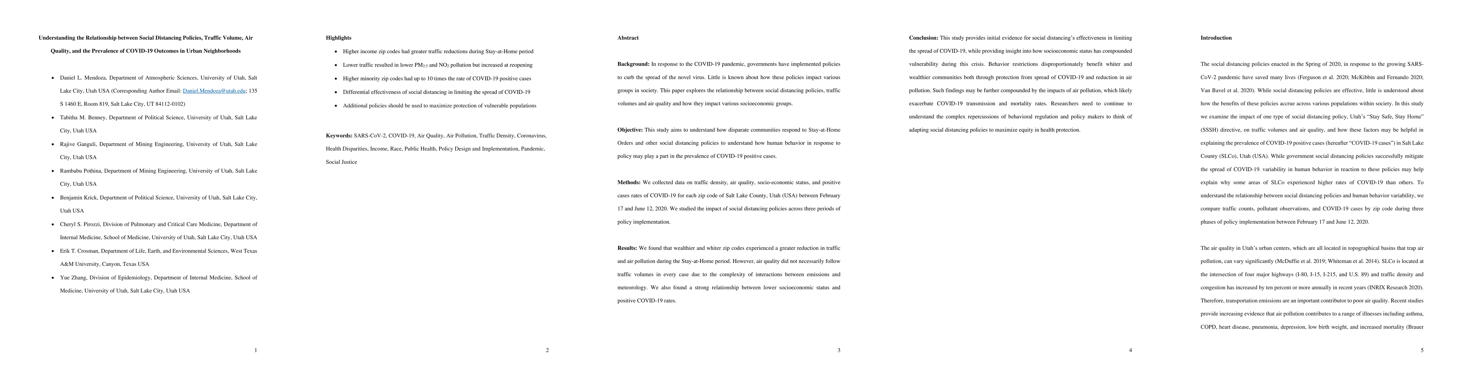 This study examines the impact of social distancing policies on traffic volume, air quality, and COVID-19 prevalence in Salt Lake County, Utah, revealing that wealthier and whiter neighborhoods experienced greater reductions in traffic and air pollution. It also highlights a strong correlation between lower socioeconomic status and higher COVID-19 rates, suggesting a need for more equitable policy adaptations.
