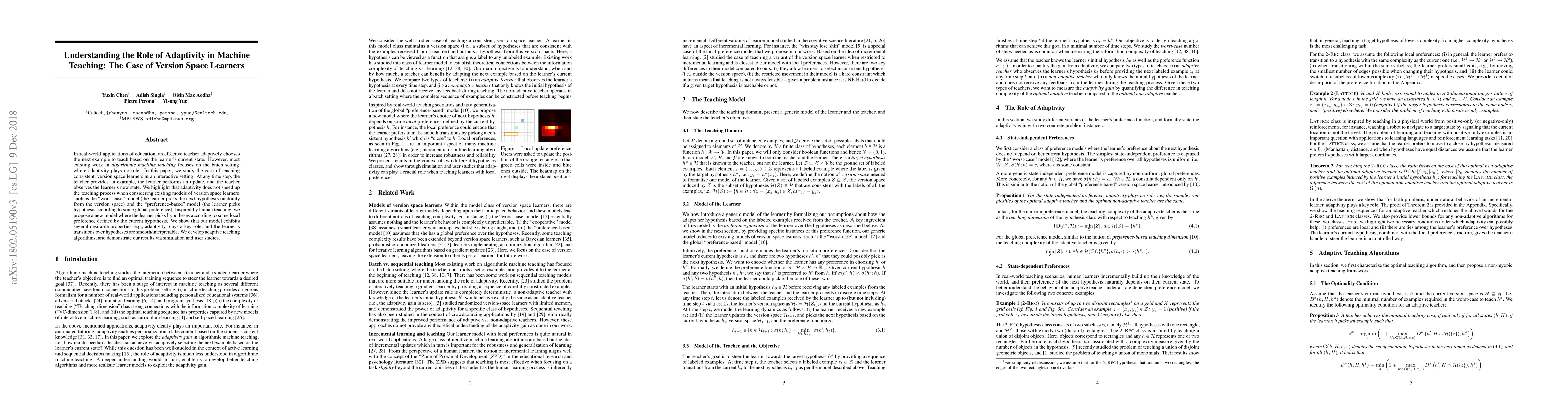 This paper explores the role of adaptivity in teaching consistent version space learners in an interactive setting, finding that existing models do not benefit from adaptivity. It proposes a new adaptive model based on local preference, demonstrating its effectiveness through efficient algorithms and empirical studies.