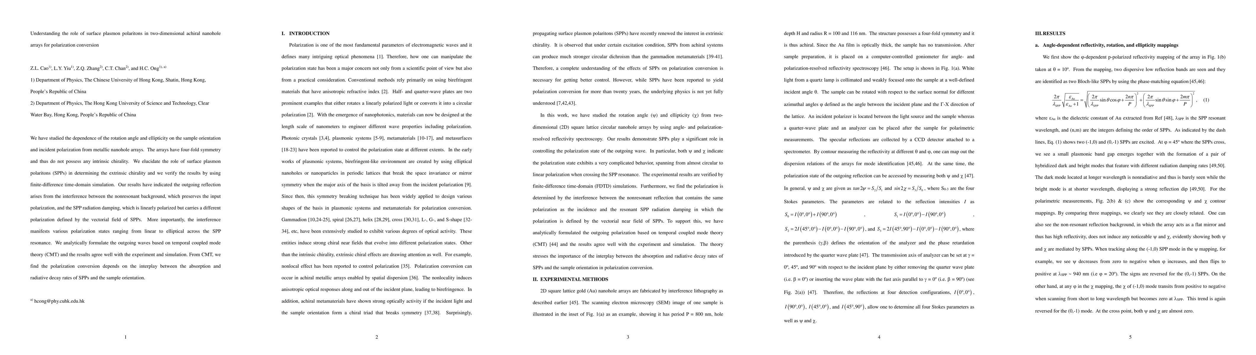 Researchers studied how metallic nanohole arrays convert polarized light into different polarization states through surface plasmon polaritons, finding that the conversion depends on the array's orientation and SPPs' absorption and radiative decay rates.