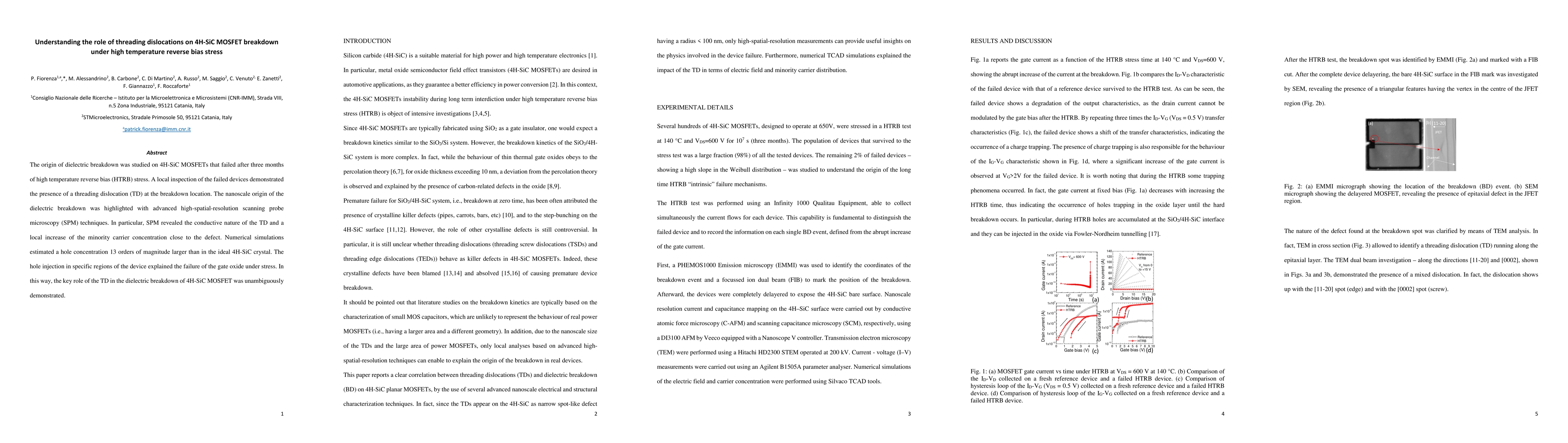 This study investigates the role of threading dislocations in the breakdown of 4H-SiC MOSFETs under high-temperature reverse bias stress, revealing that dislocations induce significant local conductivity and minority carrier concentration, leading to gate oxide failure. Advanced microscopy and simulations confirmed the dislocation's critical impact on device breakdown.