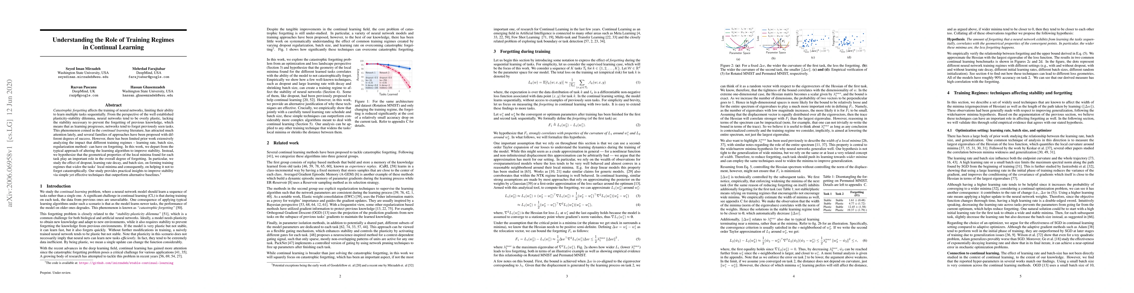 Researchers studied how different training regimes affect neural networks' ability to learn multiple tasks without forgetting previous knowledge. They found that widening the local minima of each task improves stability.
