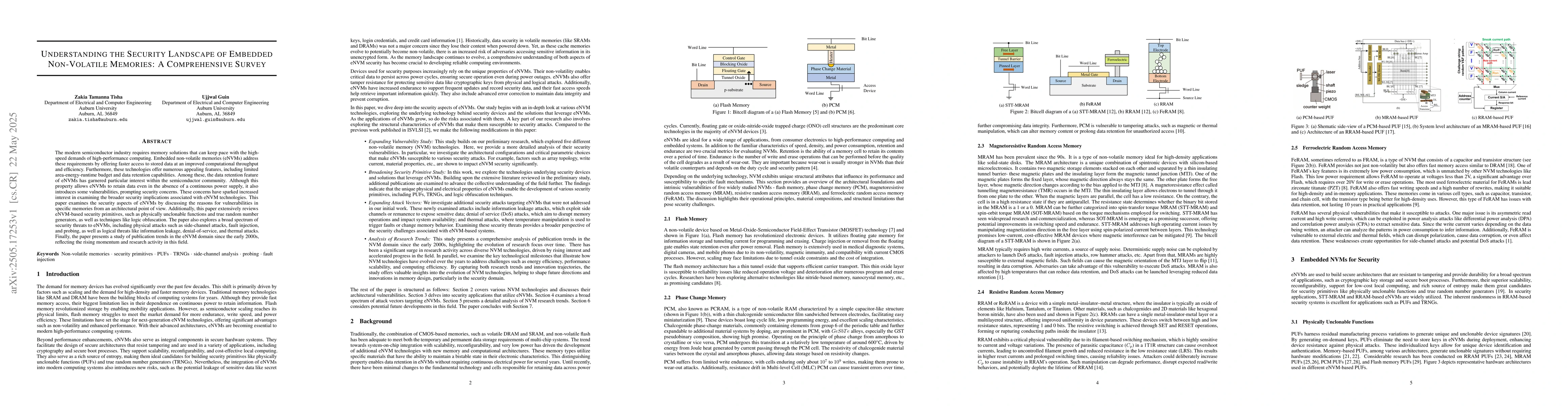 The paper provides a comprehensive survey of security aspects of embedded non-volatile memories (eNVMs) by examining vulnerabilities from an architectural perspective, reviewing security primitives, and exploring various security threats.