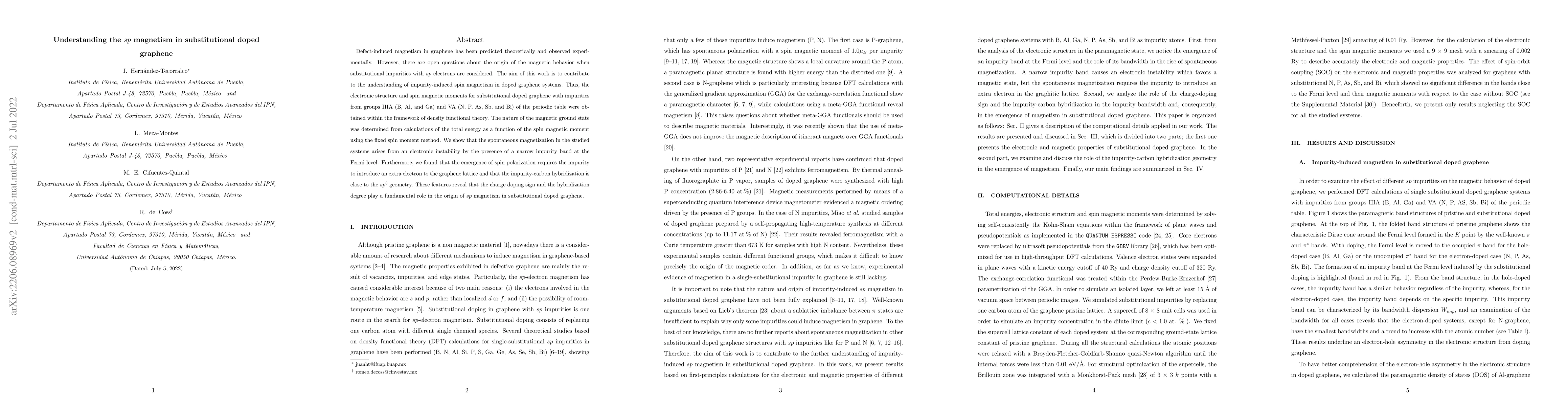 Defect-induced magnetism in graphene has been predicted theoretically and observed experimentally. However, there are open questions about the origin of the magnetic behavior when substitutional impurities with $sp$ electrons are considered. The aim of this work is to contribute to the understanding of impurity-induced spin magnetism in doped graphene systems. Thus, the electronic structure and spin magnetic moments for substitutional doped graphene with impurities from groups IIIA (B, Al, and Ga) and VA (N, P, As, Sb, and Bi) of the periodic table were obtained within the framework of density functional theory. The nature of the magnetic ground state was determined from calculations of the total energy as a function of the spin magnetic moment using the fixed spin moment method. We show that the spontaneous magnetization in the studied systems arises from an electronic instability by the presence of a narrow impurity band at the Fermi level. Furthermore, we found that the emergence of spin polarization requires the impurity to introduce an extra electron to the graphene lattice and that the impurity-carbon hybridization is close to the $sp^3$ geometry. These features reveal that the charge doping sign and the hybridization degree play a fundamental role in the origin of $sp$ magnetism in substitutional doped graphene.