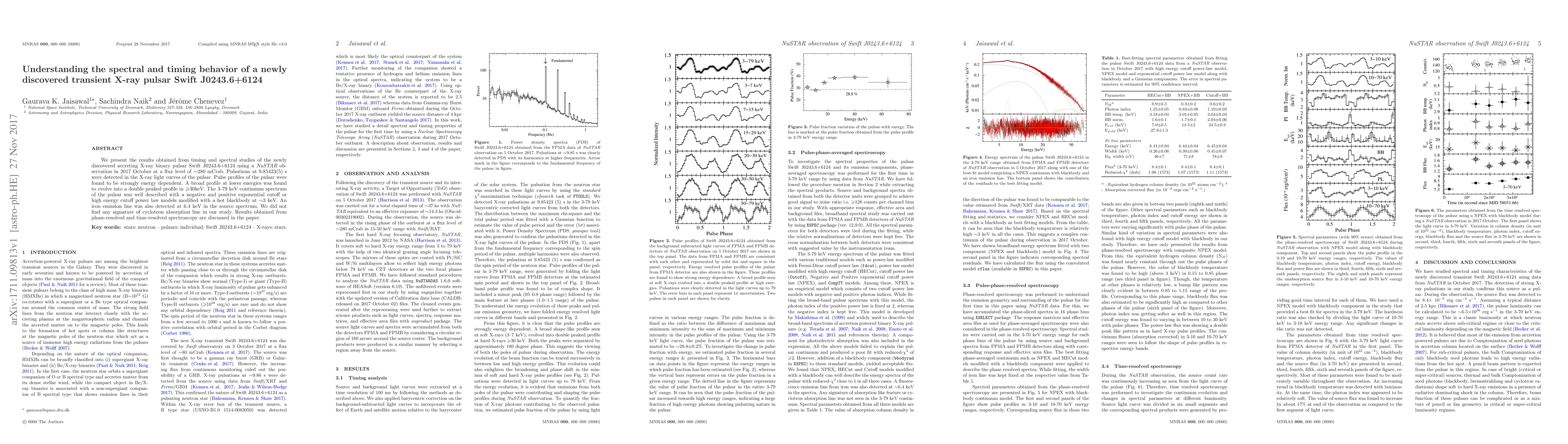 This paper reports on the spectral and timing behavior of the newly discovered transient X-ray pulsar Swift J0243.6+6124, revealing pulsations at 9.85423(5) seconds and energy-dependent pulse profiles transitioning from broad to double-peaked in higher energies. The spectrum fits a high-energy cutoff power law model with a hot blackbody and an iron emission line at 6.4 keV.
