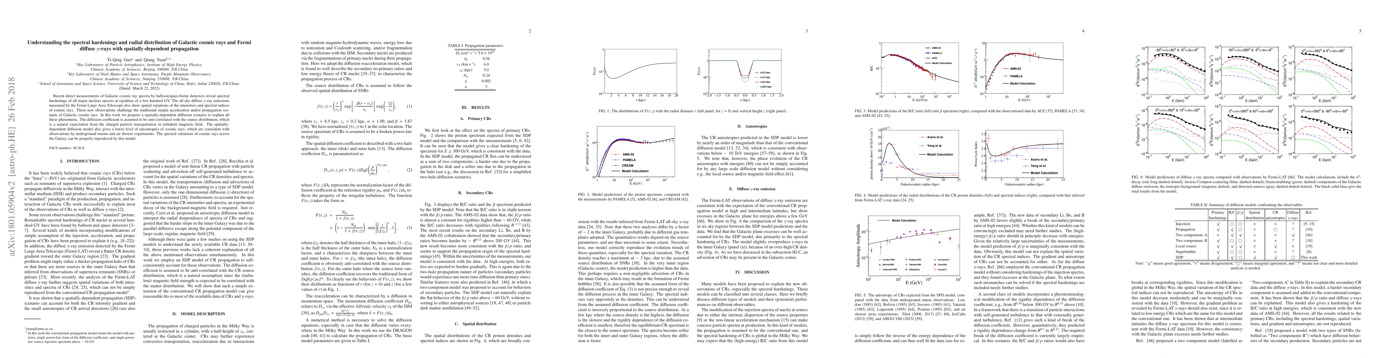 This paper proposes a spatially-dependent diffusion model to explain the spectral hardenings and radial distribution of Galactic cosmic rays and Fermi diffuse gamma-rays, addressing the challenges posed by recent observational data. The model correlates the diffusion coefficient inversely with the source distribution, aligning with charged particle transport in turbulent magnetic fields.