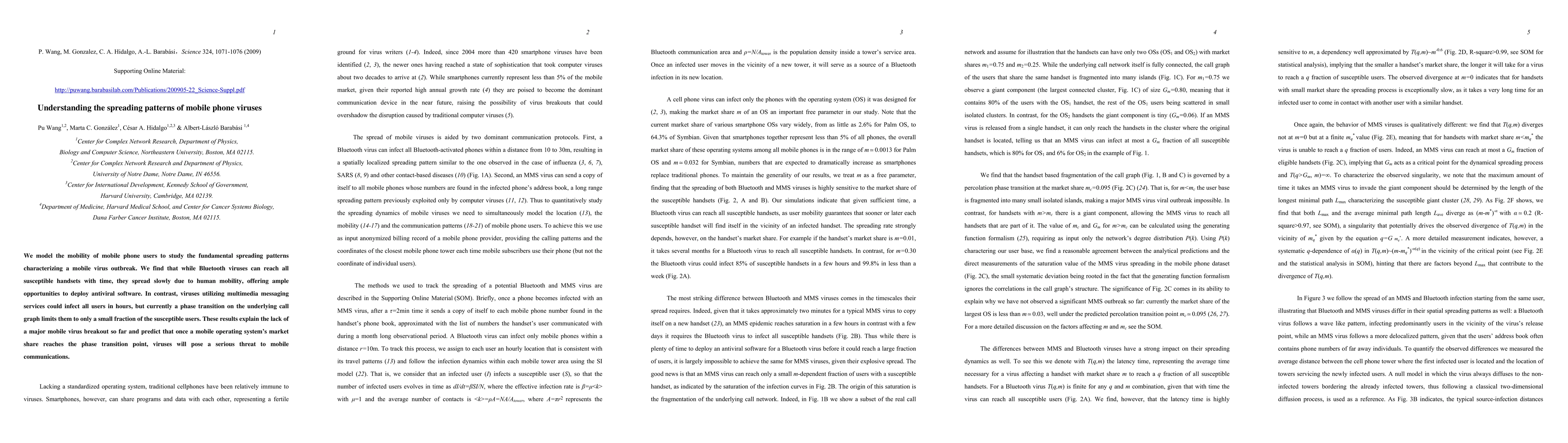 This study models mobile phone user mobility to analyze virus spreading patterns, finding that Bluetooth viruses spread slowly but can reach all users over time, while MMS viruses can infect many users quickly but are currently limited by the call graph. The research predicts a major mobile virus threat when an OS's market share reaches a critical point.