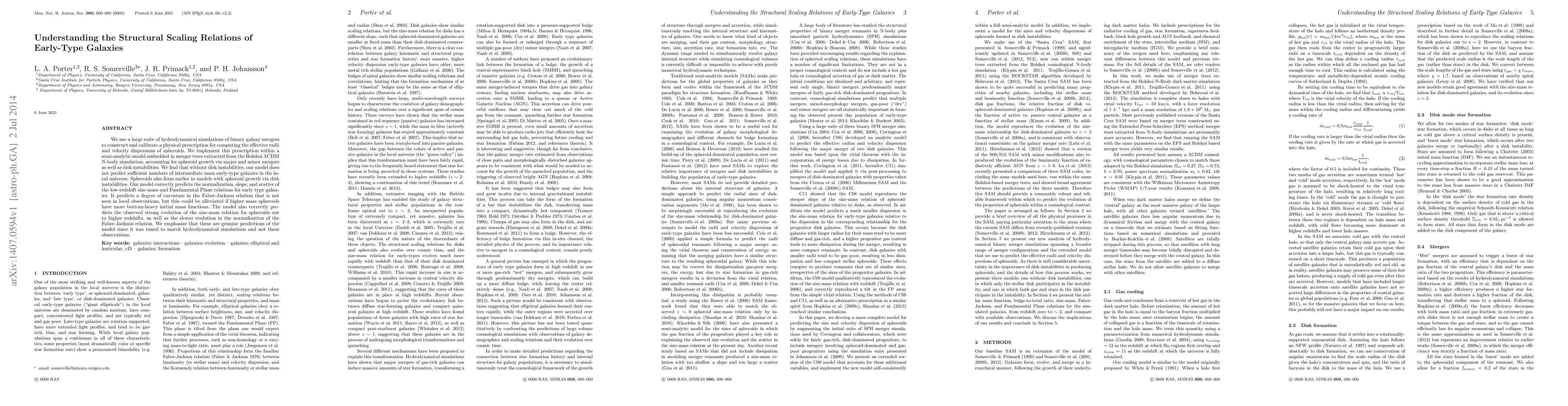 We use a large suite of hydrodynamical simulations of binary galaxy mergers to construct and calibrate a physical prescription for computing the effective radii and velocity dispersions of spheroids. We implement this prescription within a semi-analytic model embedded in merger trees extracted from the Bolshoi Lambda-CDM N-body simulation, accounting for spheroid growth via major and minor mergers as well as disk instabilities. We find that without disk instabilities, our model does not predict sufficient numbers of intermediate mass early-type galaxies in the local universe. Spheroids also form earlier in models with spheroid growth via disk instabilities. Our model correctly predicts the normalization, slope, and scatter of the low-redshift size-mass and Fundamental Plane relations for early type galaxies. It predicts a degree of curvature in the Faber-Jackson relation that is not seen in local observations, but this could be alleviated if higher mass spheroids have more bottom-heavy initial mass functions. The model also correctly predicts the observed strong evolution of the size-mass relation for spheroids out to higher redshifts, as well as the slower evolution in the normalization of the Faber-Jackson relation. We emphasize that these are genuine predictions of the model since it was tuned to match hydrodynamical simulations and not these observations.