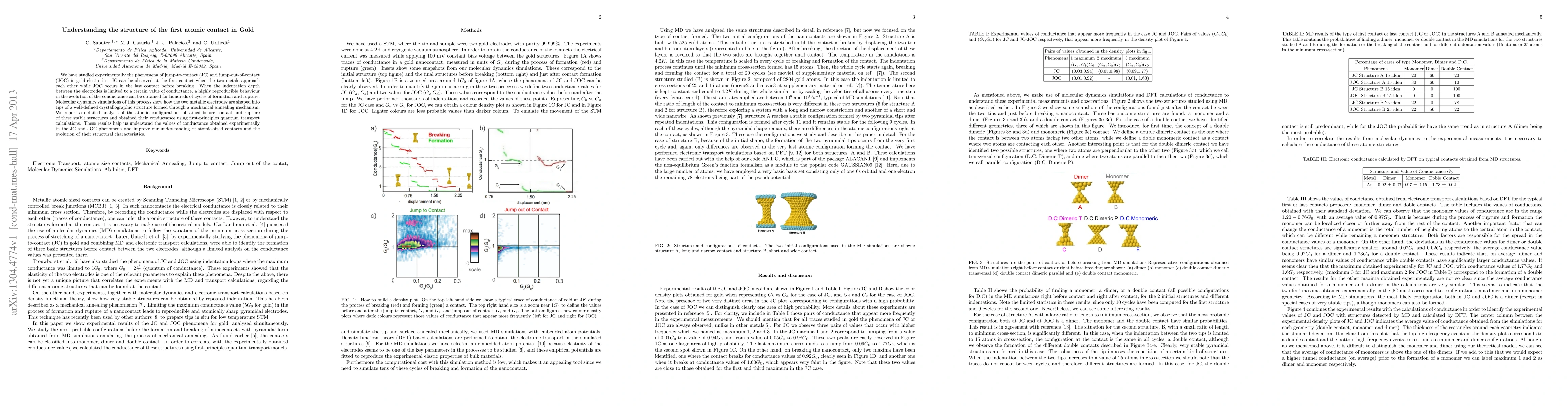 We have studied experimentally the phenomena of jump-to-contact (JC) and jump-out-of-contact (JOC) in gold electrodes. JC can be observed at the first contact when the two metals approach each other while JOC occurs in the last contact before breaking. When the indentation depth between the electrodes is limited to a certain value of conductance, a highly reproducible behaviour in the evolution of the conductance can be obtained for hundreds of cycles of formation and rupture. Molecular dynamics simulations of this process show how the two metallic electrodes are shaped into tips of a well-defined crystallographic structure formed through a mechanical annealing mechanism. We report a detailed analysis of the atomic configurations obtained before contact and rupture of these stable structures and obtained their conductance using first-principlesquantum transport calculations. These results help us understand the values of conductance obtained experimentally in the JC and JOC phenomena and improve our understanding of atomic-sized contacts and the evolution of their structural characteristics.
