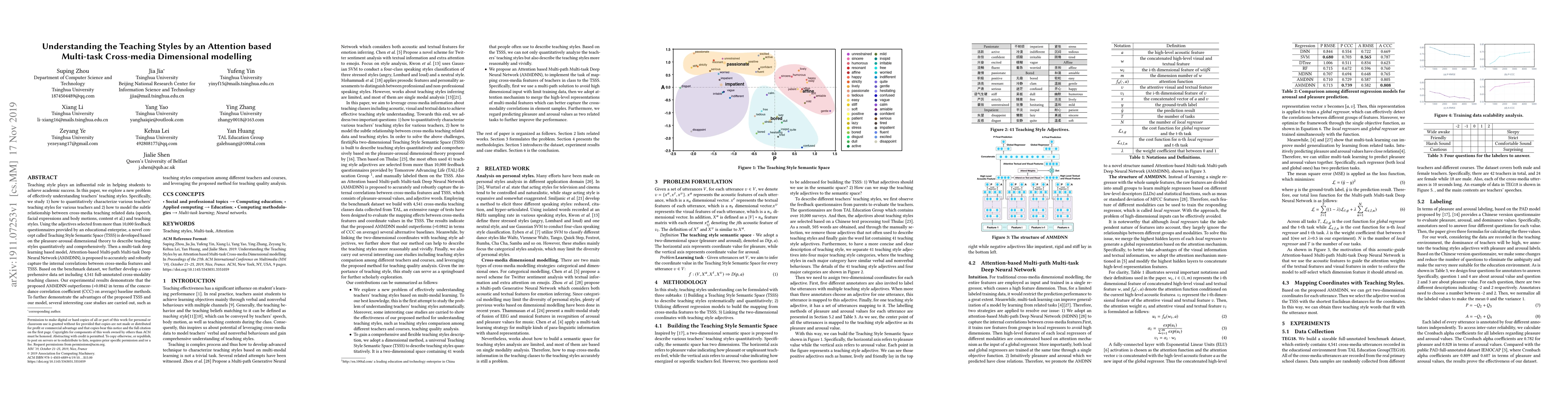 Teaching style plays an influential role in helping students to achieve academic success. In this paper, we explore a new problem of effectively understanding teachers' teaching styles. Specifically, we study 1) how to quantitatively characterize various teachers' teaching styles for various teachers and 2) how to model the subtle relationship between cross-media teaching related data (speech, facial expressions and body motions, content et al.) and teaching styles. Using the adjectives selected from more than 10,000 feedback questionnaires provided by an educational enterprise, a novel concept called Teaching Style Semantic Space (TSSS) is developed based on the pleasure-arousal dimensional theory to describe teaching styles quantitatively and comprehensively. Then a multi-task deep learning based model, Attention-based Multi-path Multi-task Deep Neural Network (AMMDNN), is proposed to accurately and robustly capture the internal correlations between cross-media features and TSSS. Based on the benchmark dataset, we further develop a comprehensive data set including 4,541 full-annotated cross-modality teaching classes. Our experimental results demonstrate that the proposed AMMDNN outperforms (+0.0842 in terms of the concordance correlation coefficient (CCC) on average) baseline methods. To further demonstrate the advantages of the proposed TSSS and our model, several interesting case studies are carried out, such as teaching styles comparison among different teachers and courses, and leveraging the proposed method for teaching quality analysis.