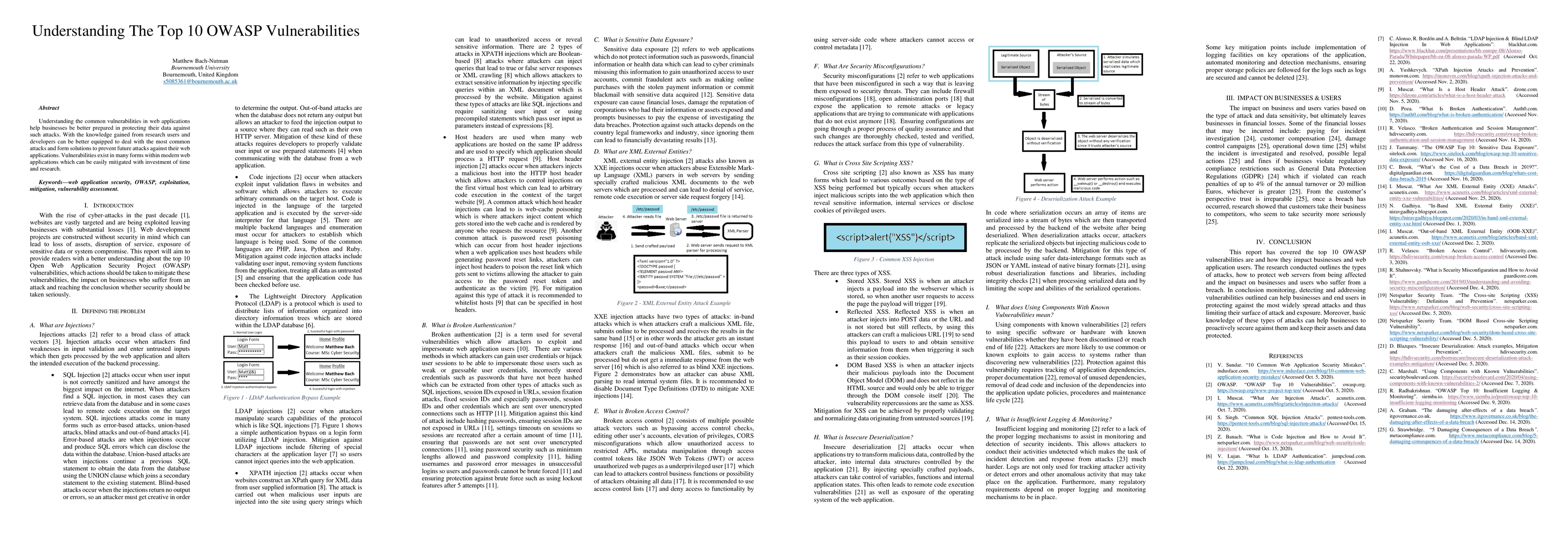 This research paper identifies the top 10 OWASP vulnerabilities in web applications, providing insights for businesses to protect their data against common attacks. Understanding these vulnerabilities enables developers to form solutions and prevent future attacks with a time investment.