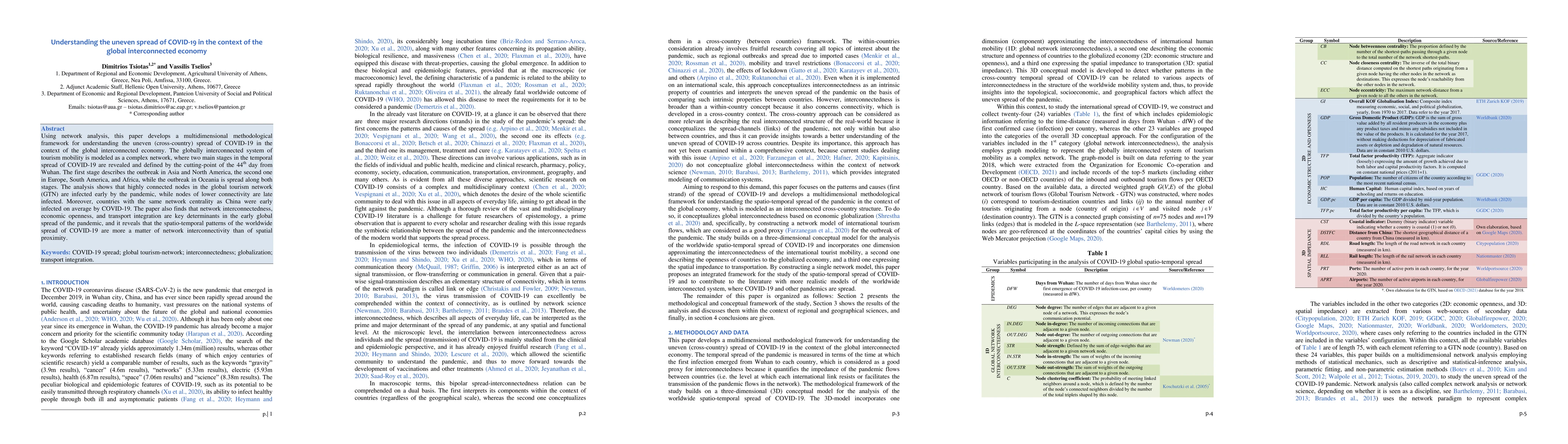 Using network analysis, this paper develops a multidimensional methodological framework for understanding the uneven (cross-country) spread of COVID-19 in the context of the global interconnected economy. The globally interconnected system of tourism mobility is modeled as a complex network, where two main stages in the temporal spread of COVID-19 are revealed and defined by the cutting-point of the 44th day from Wuhan. The first stage describes the outbreak in Asia and North America, the second one in Europe, South America, and Africa, while the outbreak in Oceania is spread along both stages. The analysis shows that highly connected nodes in the global tourism network (GTN) are infected early by the pandemic, while nodes of lower connectivity are late infected. Moreover, countries with the same network centrality as China were early infected on average by COVID-19. The paper also finds that network interconnectedness, economic openness, and transport integration are key determinants in the early global spread of the pandemic, and it reveals that the spatio-temporal patterns of the worldwide spread of COVID-19 are more a matter of network interconnectivity than of spatial proximity.