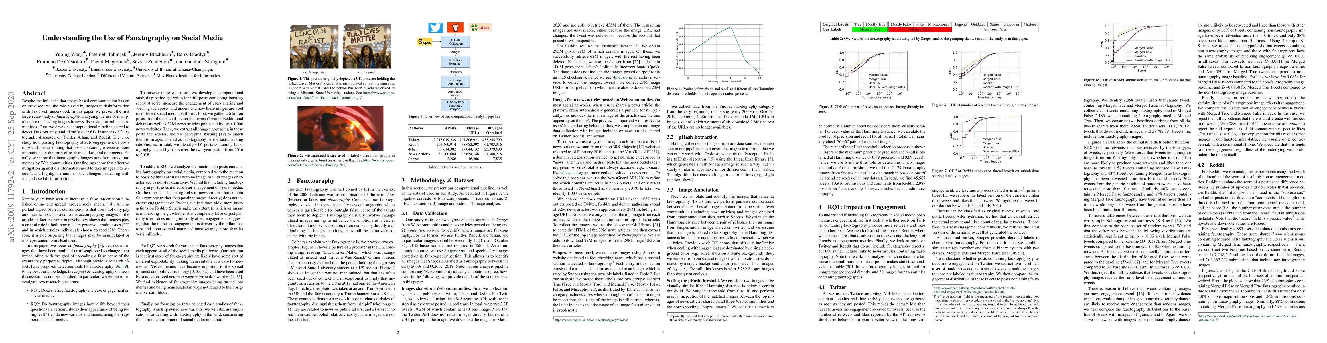 Despite the influence that image-based communication has on online discourse, the role played by images in disinformation is still not well understood. In this paper, we present the first large-scale study of fauxtography, analyzing the use of manipulated or misleading images in news discussion on online communities. First, we develop a computational pipeline geared to detect fauxtography, and identify over 61k instances of fauxtography discussed on Twitter, 4chan, and Reddit. Then, we study how posting fauxtography affects engagement of posts on social media, finding that posts containing it receive more interactions in the form of re-shares, likes, and comments. Finally, we show that fauxtography images are often turned into memes by Web communities. Our findings show that effective mitigation against disinformation need to take images into account, and highlight a number of challenges in dealing with image-based disinformation.