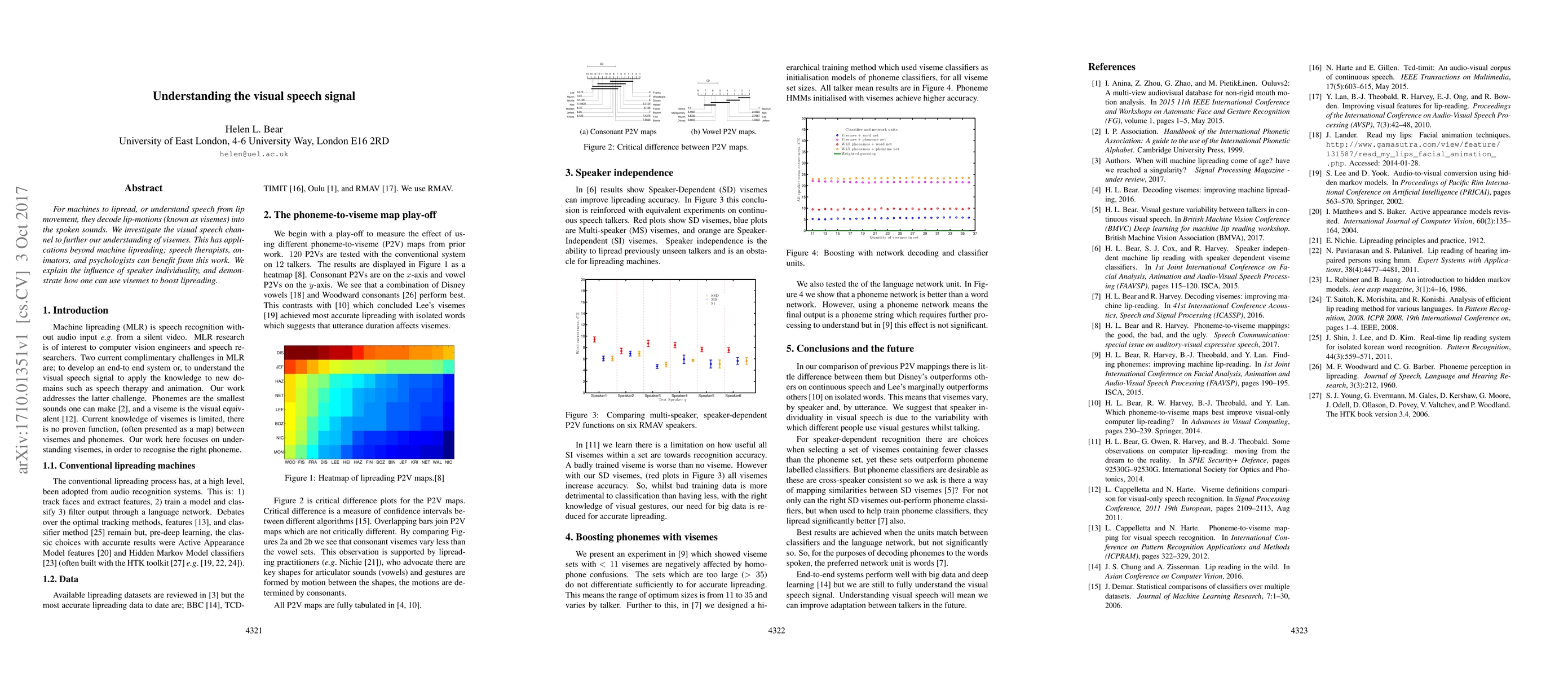 For machines to lipread, or understand speech from lip movement, they decode lip-motions (known as visemes) into the spoken sounds. We investigate the visual speech channel to further our understanding of visemes. This has applications beyond machine lipreading; speech therapists, animators, and psychologists can benefit from this work. We explain the influence of speaker individuality, and demonstrate how one can use visemes to boost lipreading.