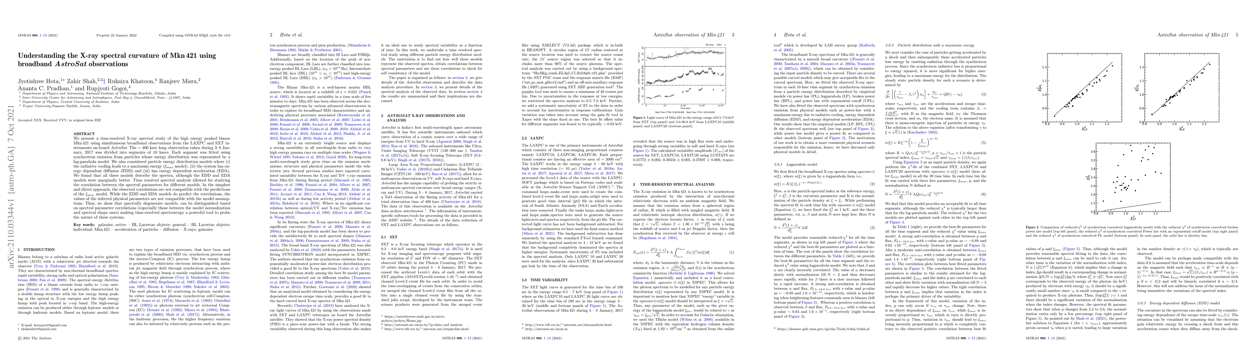 We present a time-resolved X-ray spectral study of the high energy peaked blazar Mkn 421 using simultaneous broadband observations from the LAXPC and SXT instruments on-board AstroSat. The ~ 400 ksec long observation taken during 3-8 January, 2017 was divided into segments of 10 ksecs. Each segment was fitted using synchrotron emission from particles whose energy distribution was represented by a log-parabola model. We also considered particle energy distribution models where (i) the radiative cooling leads to a maximum energy ({\xi} max model), (ii) the system has energy dependent diffusion (EDD) and (iii) has energy dependent acceleration (EDA). We found that all these models describe the spectra, although the EDD and EDA models were marginally better. Time resolved spectral analysis allowed for studying the correlation between the spectral parameters for different models. In the simplest and direct approach, the observed correlations are not compatible with the predictions of the {\xi} max model. While the EDD and EDA models do predict the correlations, the values of the inferred physical parameters are not compatible with the model assumptions. Thus, we show that spectrally degenerate models, can be distinguished based on spectral parameter correlations (especially those between the model normalization and spectral shape ones) making time-resolved spectroscopy a powerful tool to probe the nature of these systems.