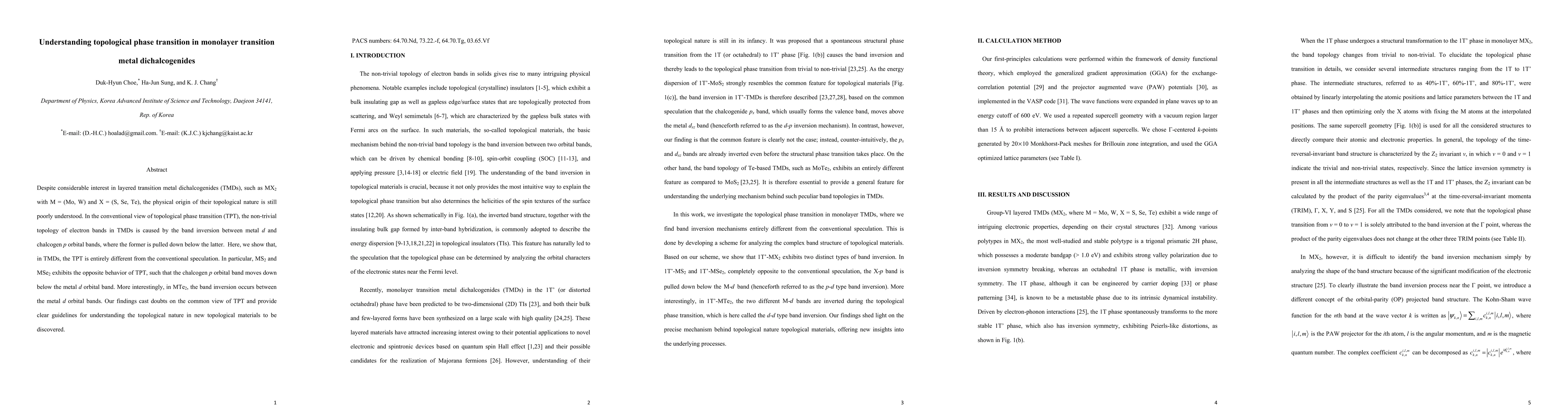 This paper reveals that the topological phase transition in transition metal dichalcogenides (TMDs) occurs contrary to conventional expectations, with chalcogen p orbital bands moving below metal d orbital bands in MS2 and MSe2, and band inversion occurring between metal d orbital bands in MTe2. These findings challenge existing theories and offer new insights into the topological properties of TMDs.