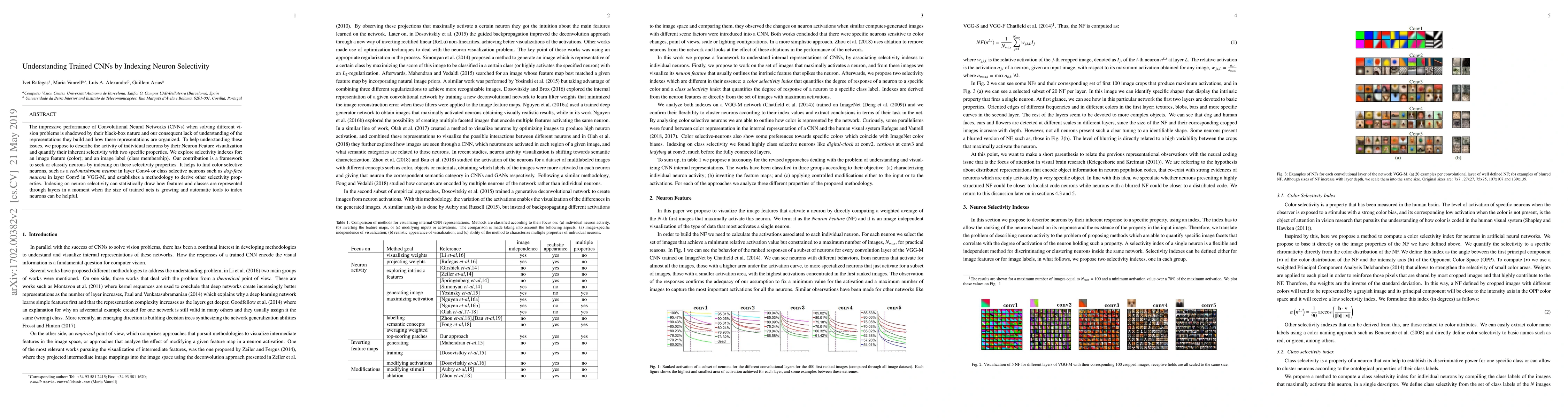 The impressive performance of Convolutional Neural Networks (CNNs) when solving different vision problems is shadowed by their black-box nature and our consequent lack of understanding of the representations they build and how these representations are organized. To help understanding these issues, we propose to describe the activity of individual neurons by their Neuron Feature visualization and quantify their inherent selectivity with two specific properties. We explore selectivity indexes for: an image feature (color); and an image label (class membership). Our contribution is a framework to seek or classify neurons by indexing on these selectivity properties. It helps to find color selective neurons, such as a red-mushroom neuron in layer Conv4 or class selective neurons such as dog-face neurons in layer Conv5 in VGG-M, and establishes a methodology to derive other selectivity properties. Indexing on neuron selectivity can statistically draw how features and classes are represented through layers in a moment when the size of trained nets is growing and automatic tools to index neurons can be helpful.