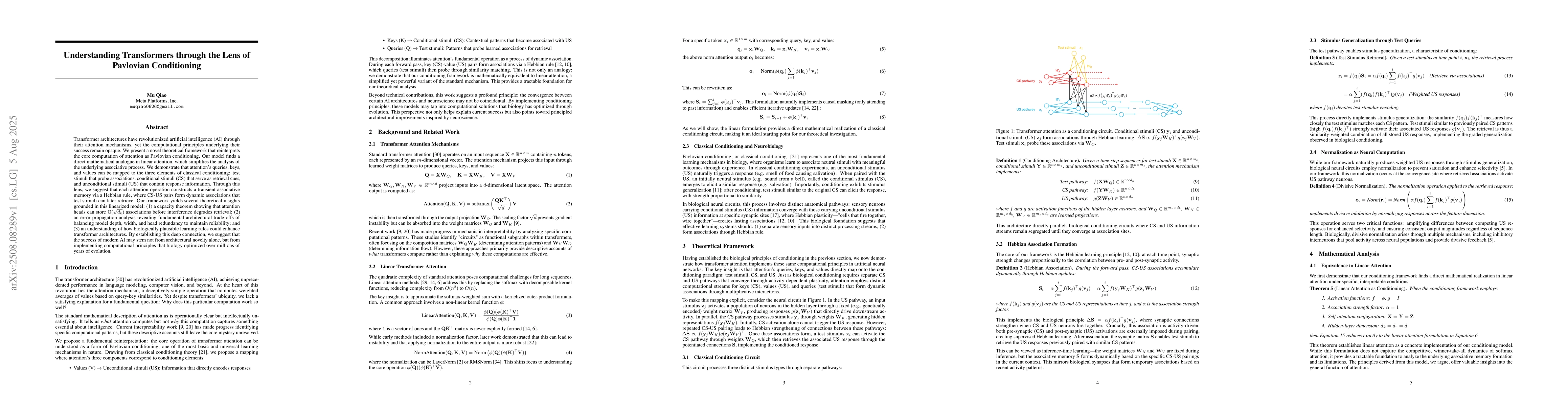 Transformer architectures have revolutionized artificial intelligence (AI) through their attention mechanisms, yet the computational principles underlying their success remain opaque. We present a novel theoretical framework that reinterprets the core computation of attention as Pavlovian conditioning. Our model finds a direct mathematical analogue in linear attention, which simplifies the analysis of the underlying associative process. We demonstrate that attention's queries, keys, and values can be mapped to the three elements of classical conditioning: test stimuli that probe associations, conditional stimuli (CS) that serve as retrieval cues, and unconditional stimuli (US) that contain response information. Through this lens, we suggest that each attention operation constructs a transient associative memory via a Hebbian rule, where CS-US pairs form dynamic associations that test stimuli can later retrieve. Our framework yields several theoretical insights grounded in this linearized model: (1) a capacity theorem showing that attention heads can store O($\sqrt{d_k}$) associations before interference degrades retrieval; (2) an error propagation analysis revealing fundamental architectural trade-offs of balancing model depth, width, and head redundancy to maintain reliability; and (3) an understanding of how biologically plausible learning rules could enhance transformer architectures. By establishing this deep connection, we suggest that the success of modern AI may stem not from architectural novelty alone, but from implementing computational principles that biology optimized over millions of years of evolution.