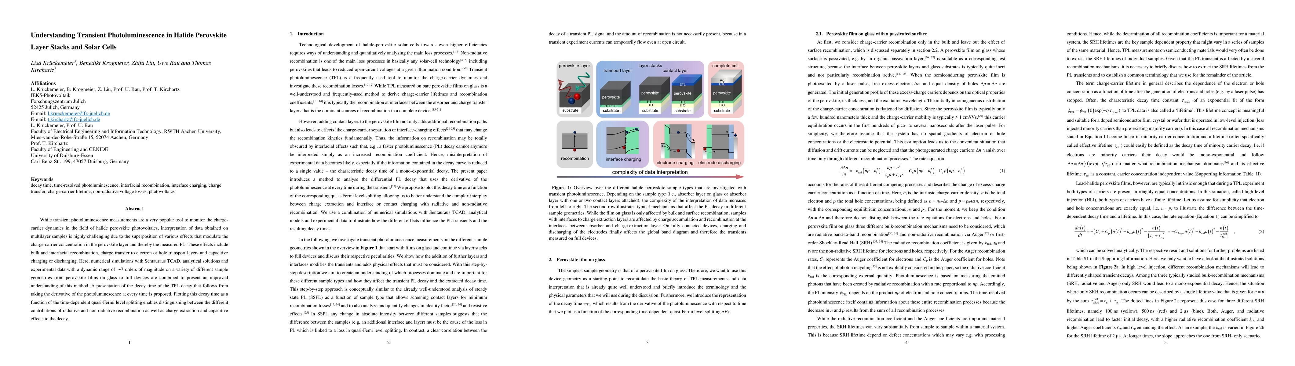 This paper combines numerical simulations, analytical solutions, and experimental data to improve the interpretation of transient photoluminescence in halide perovskite layers, addressing the complexities of charge-carrier dynamics in multilayer samples. The study proposes a method to distinguish between radiative and non-radiative recombination, charge extraction, and capacitive effects by analyzing the decay time of transient photoluminescence.