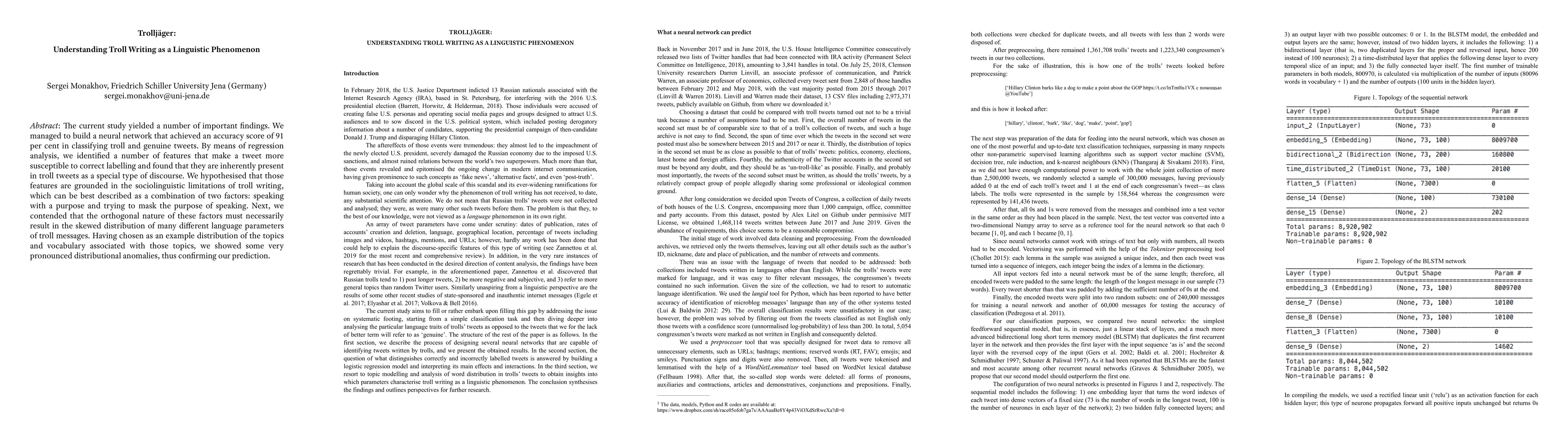 The current study yielded a number of important findings. We managed to build a neural network that achieved an accuracy score of 91 per cent in classifying troll and genuine tweets. By means of regression analysis, we identified a number of features that make a tweet more susceptible to correct labelling and found that they are inherently present in troll tweets as a special type of discourse. We hypothesised that those features are grounded in the sociolinguistic limitations of troll writing, which can be best described as a combination of two factors: speaking with a purpose and trying to mask the purpose of speaking. Next, we contended that the orthogonal nature of these factors must necessarily result in the skewed distribution of many different language parameters of troll messages. Having chosen as an example distribution of the topics and vocabulary associated with those topics, we showed some very pronounced distributional anomalies, thus confirming our prediction.