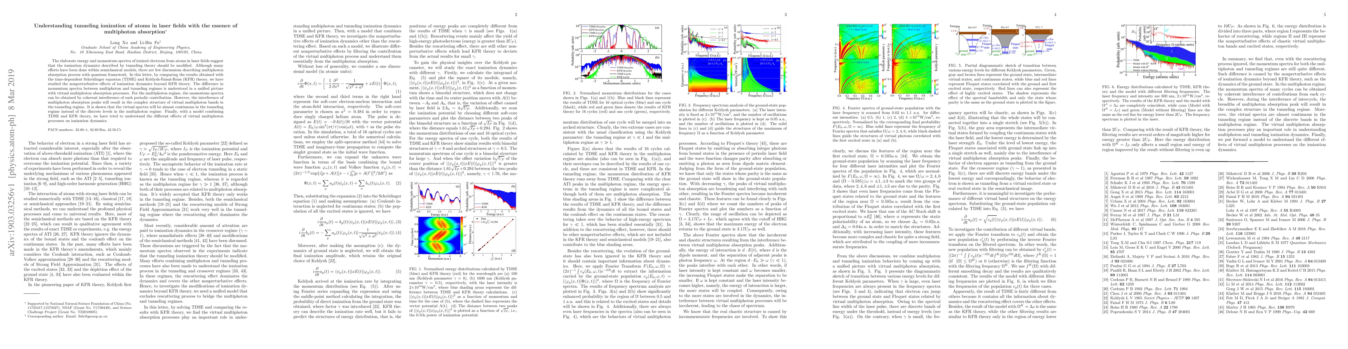 The elaborate energy and momentum spectra of ionized electrons from atoms in laser fields suggest that the ionization dynamics described by tunneling theory should be modified. Although many efforts have been done within semiclassical models, there are few discussions describing multiphoton absorption process with quantum framework. In this letter, by comparing the results obtained with the time-dependent Schrodinger equation (TDSE) and Keldysh-Faisal-Reiss (KFR) theory, we have studied the nonperturbative effects of ionization dynamics beyond KFR theory. The difference in momentum spectra between multiphoton and tunneling regimes is understood in a unified picture with virtual multiphoton absorption processes. For the multiphoton regime, the momentum spectra can be obtained by coherent interference of each periodic contribution. However, the interference of multiphoton absorption peaks will result in the complex structure of virtual multiphoton bands in the tunneling regime. It is shown that the virtual spectra will be almost continuous in the tunneling regime instead of the discrete levels in the multiphoton regime. Finally, with a model combining TDSE and KFR theory, we have tried to understand the different effects of virtual multiphoton processes on ionization dynamics.