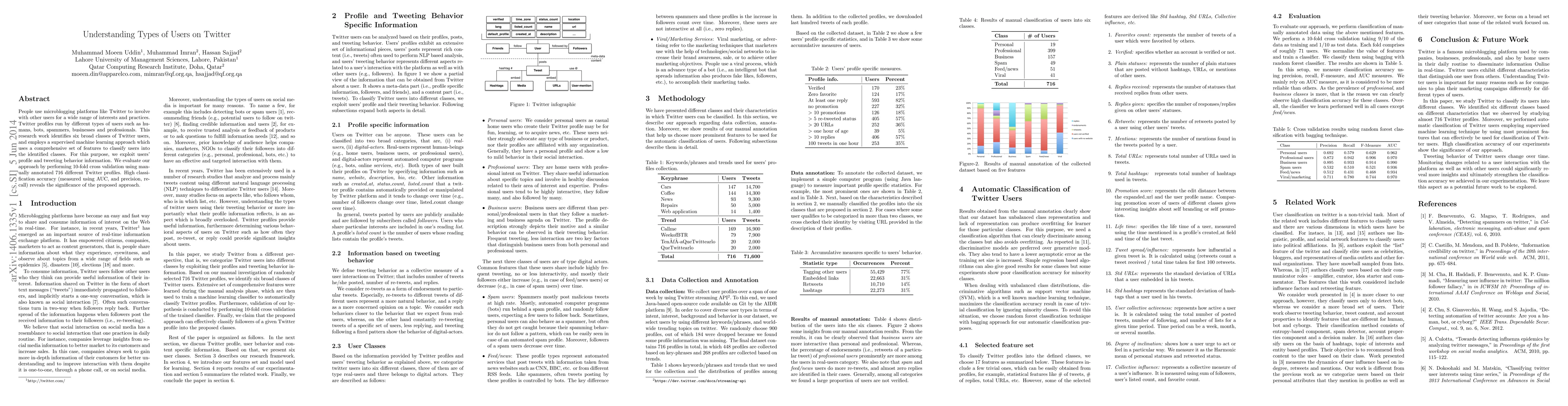 This research identifies six broad classes of Twitter users—humans, bots, spammers, businesses, and professionals—using a supervised machine learning approach based on profile and tweeting behavior features. The method achieves high classification accuracy through 10-fold cross validation on manually annotated data.